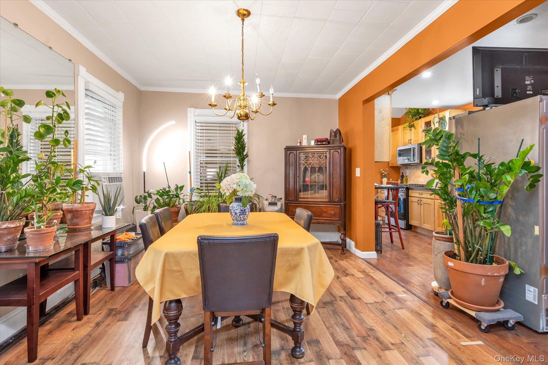 - Dining area with crown molding, light wood finished floors, and a chandelier