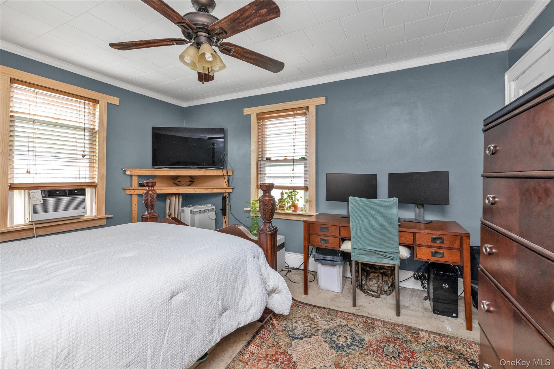 - Bedroom featuring crown molding, ceiling fan, and a desk