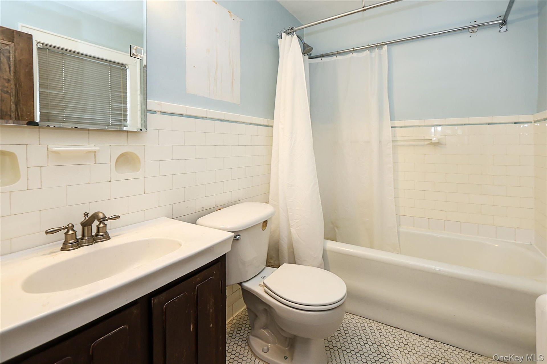 - Full bathroom with shower / tub combo with curtain, tile walls, vanity, and tile patterned flooring