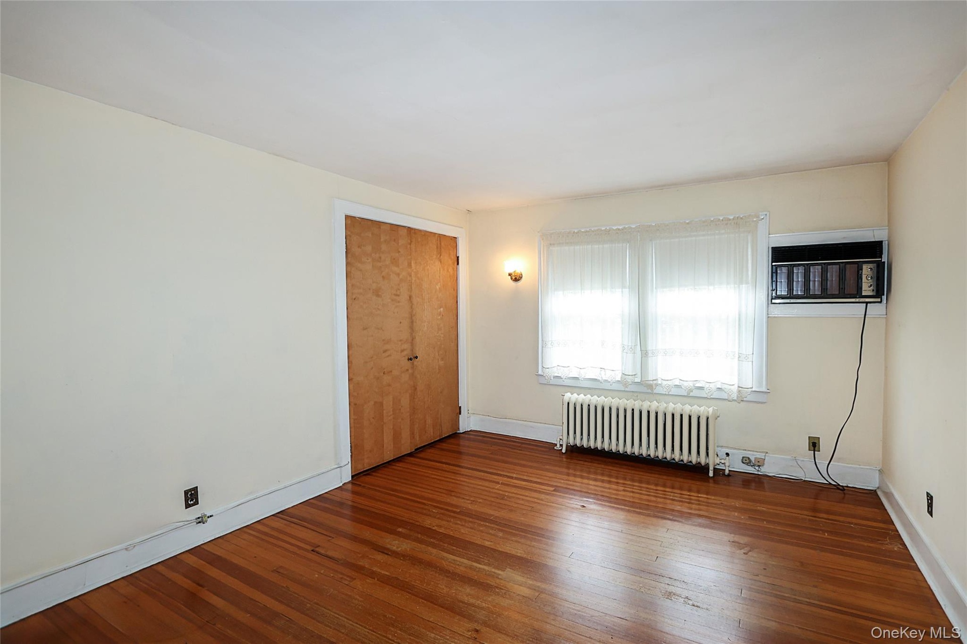 - Unfurnished room featuring radiator heating unit, wood-type flooring, and a wall mounted air conditioner