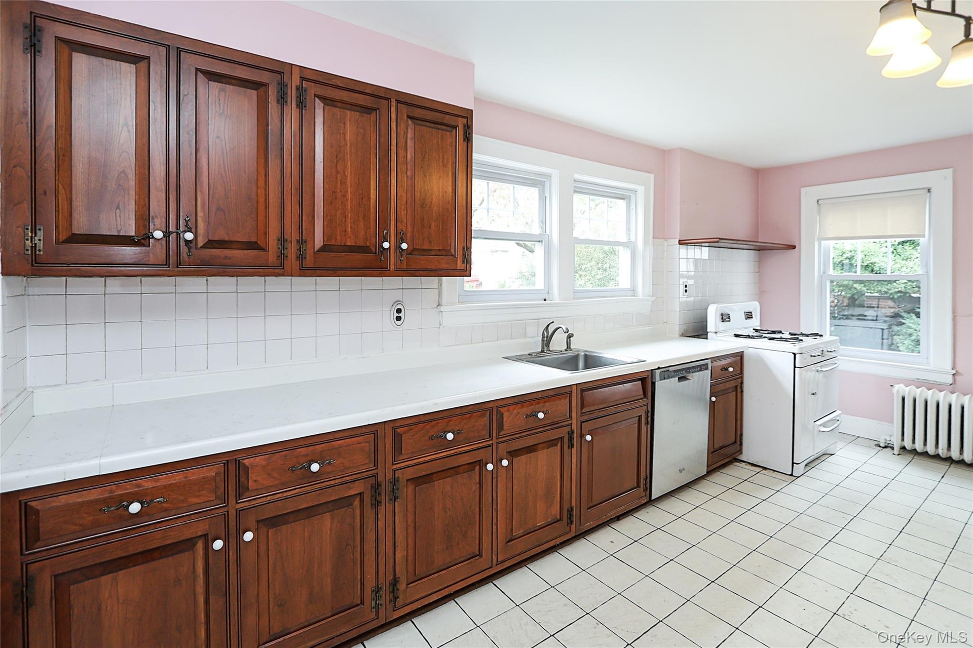 - Kitchen with white appliances, light countertops, radiator, tasteful backsplash, and light tile patterned floors