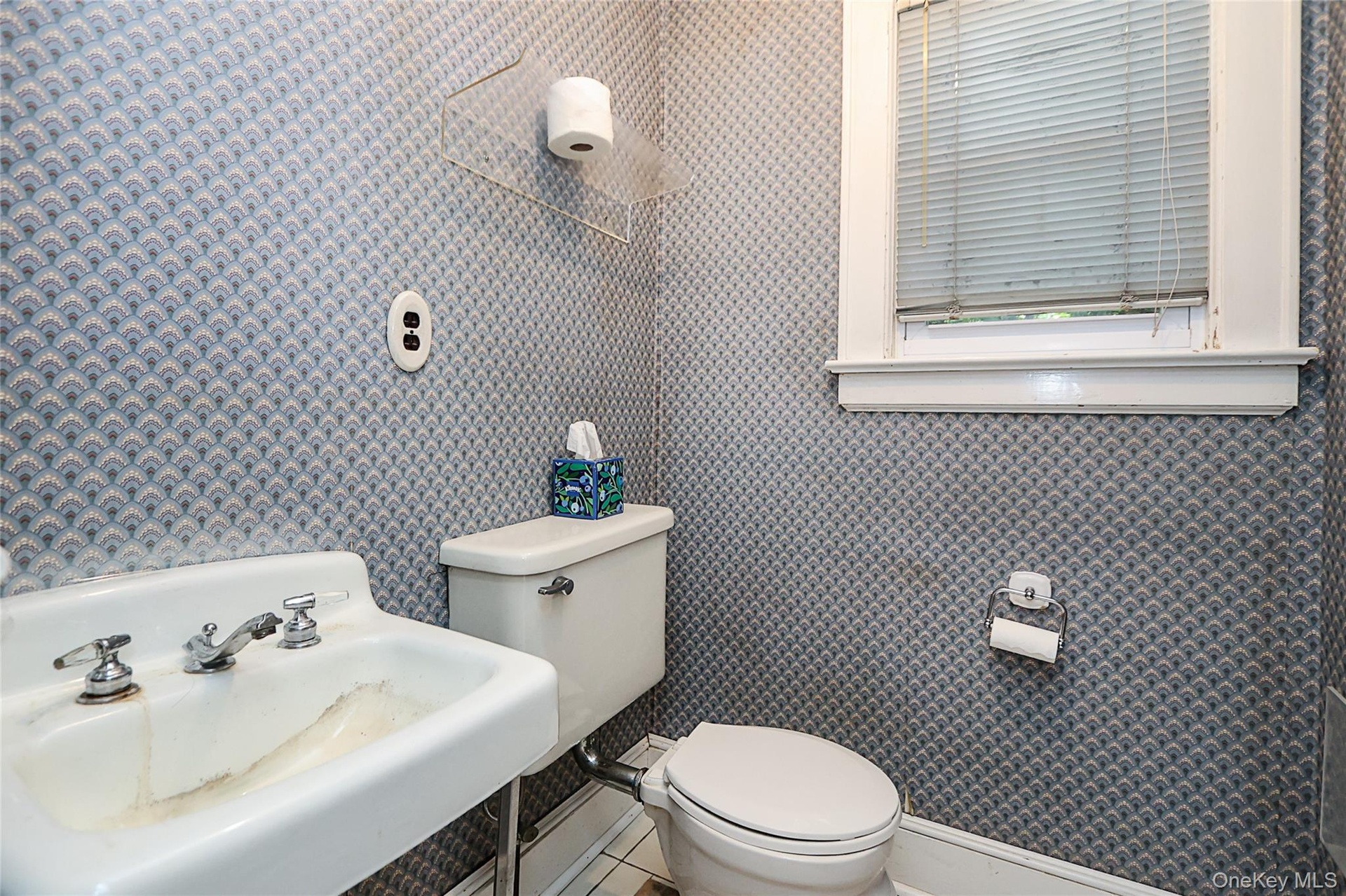 - Bathroom featuring wallpapered walls and tile patterned flooring