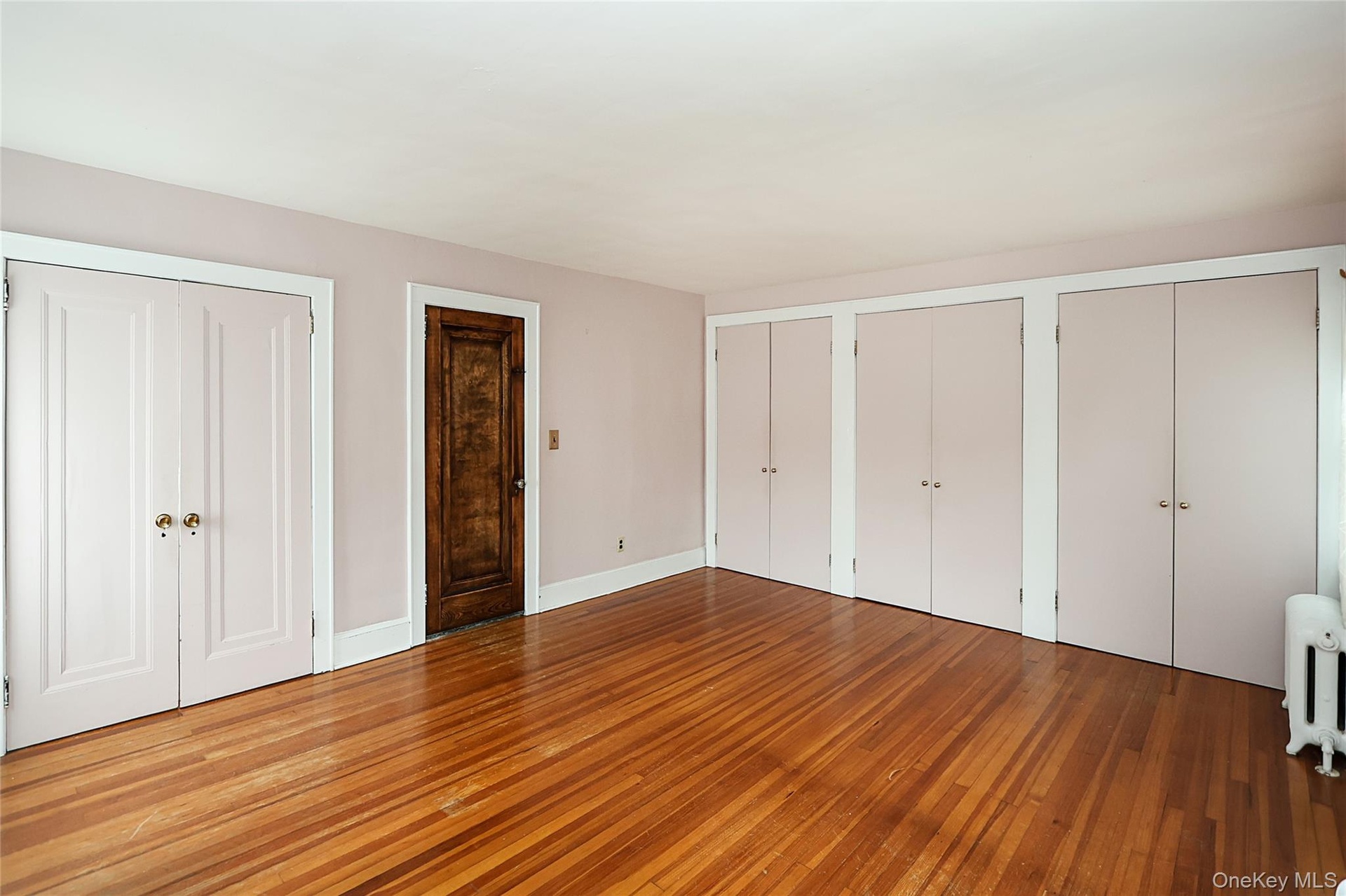 - Unfurnished bedroom with multiple closets, wood-type flooring, and radiator heating unit
