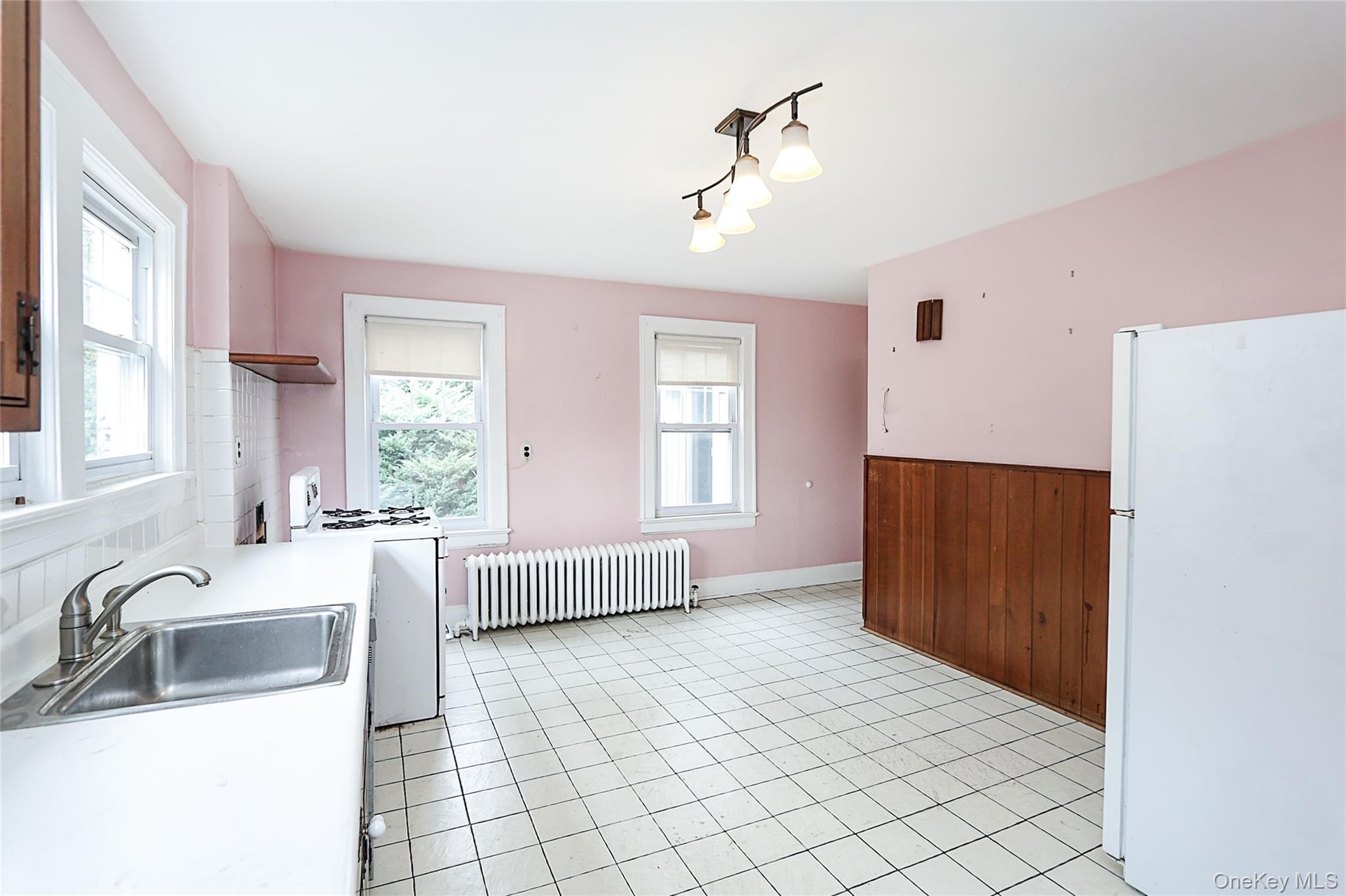 - Kitchen featuring white appliances, radiator heating unit, wooden walls, light countertops, and light tile patterned flooring