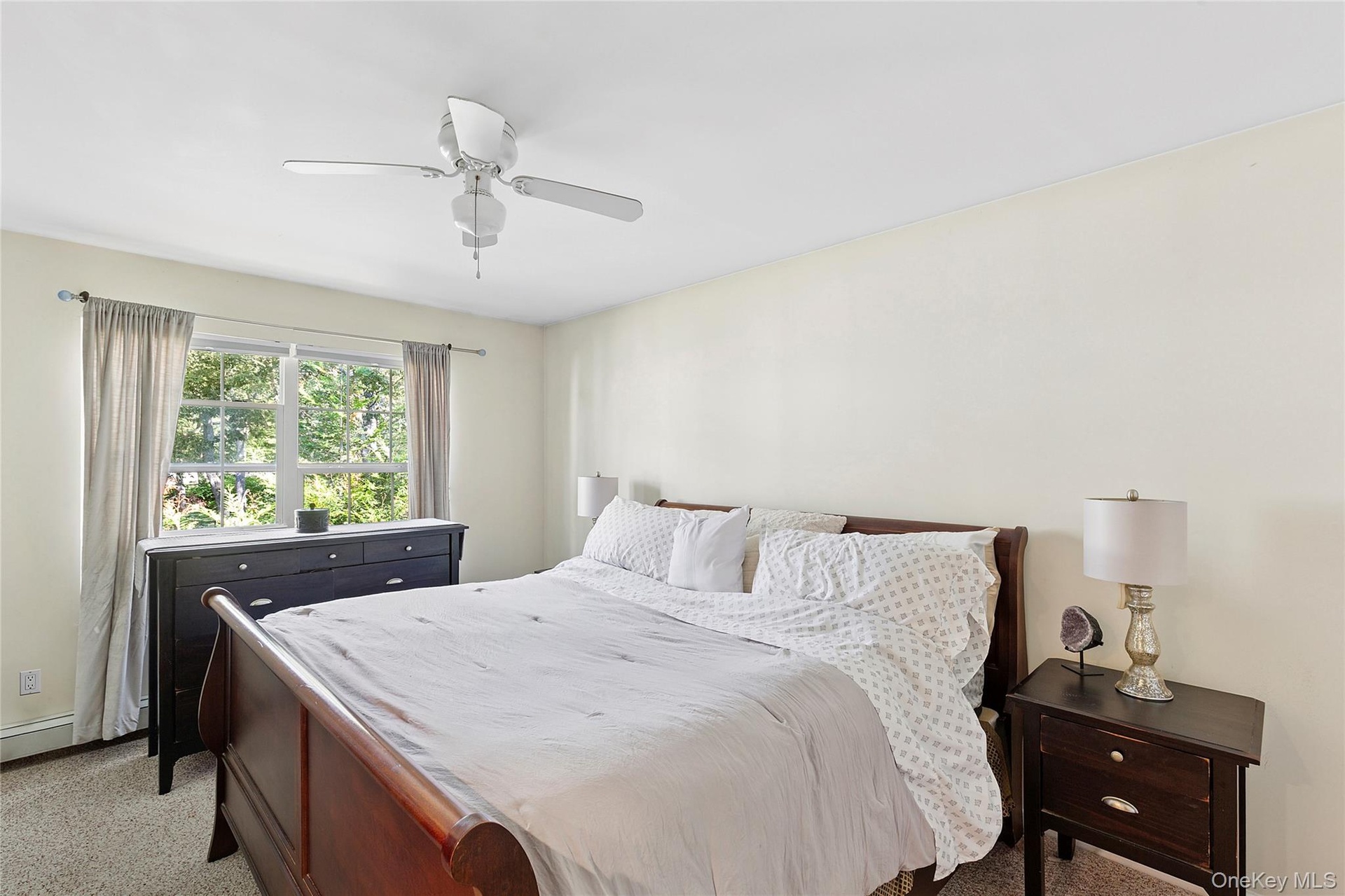- Carpeted living area featuring ceiling fan and a baseboard heating unit
