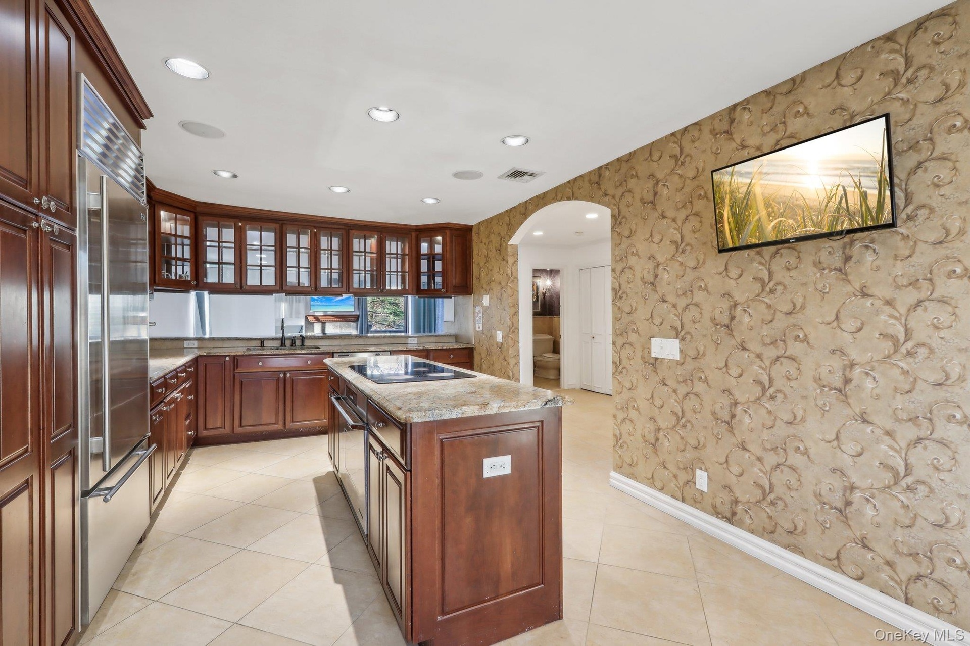 - Kitchen with wallpapered walls, arched walkways, recessed lighting, a center island, and glass insert cabinets