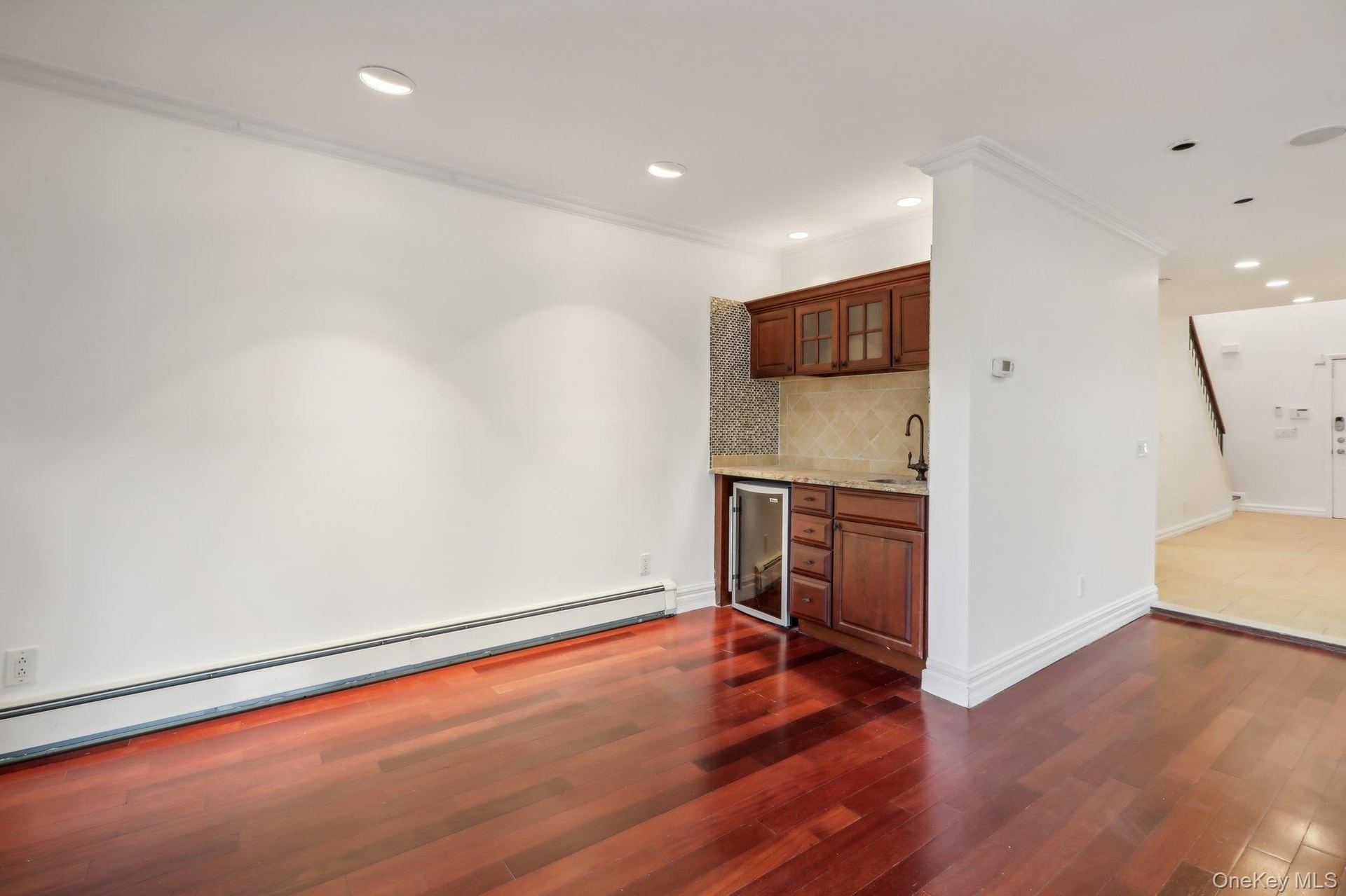 - Unfurnished living room with a bar, a baseboard heating unit, dark wood-type flooring, recessed lighting, and beverage cooler