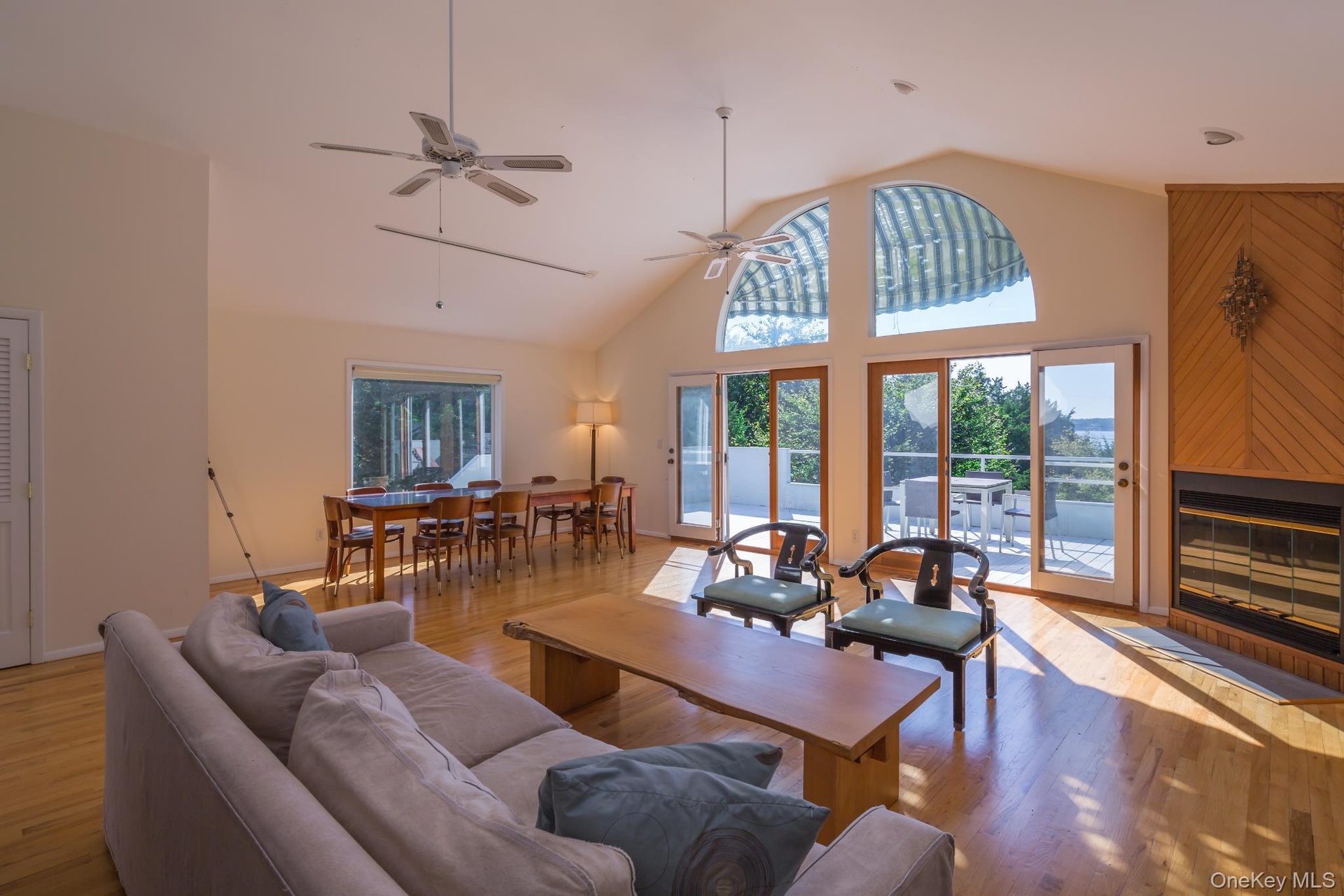- Living area featuring high vaulted ceiling and light wood finished floors