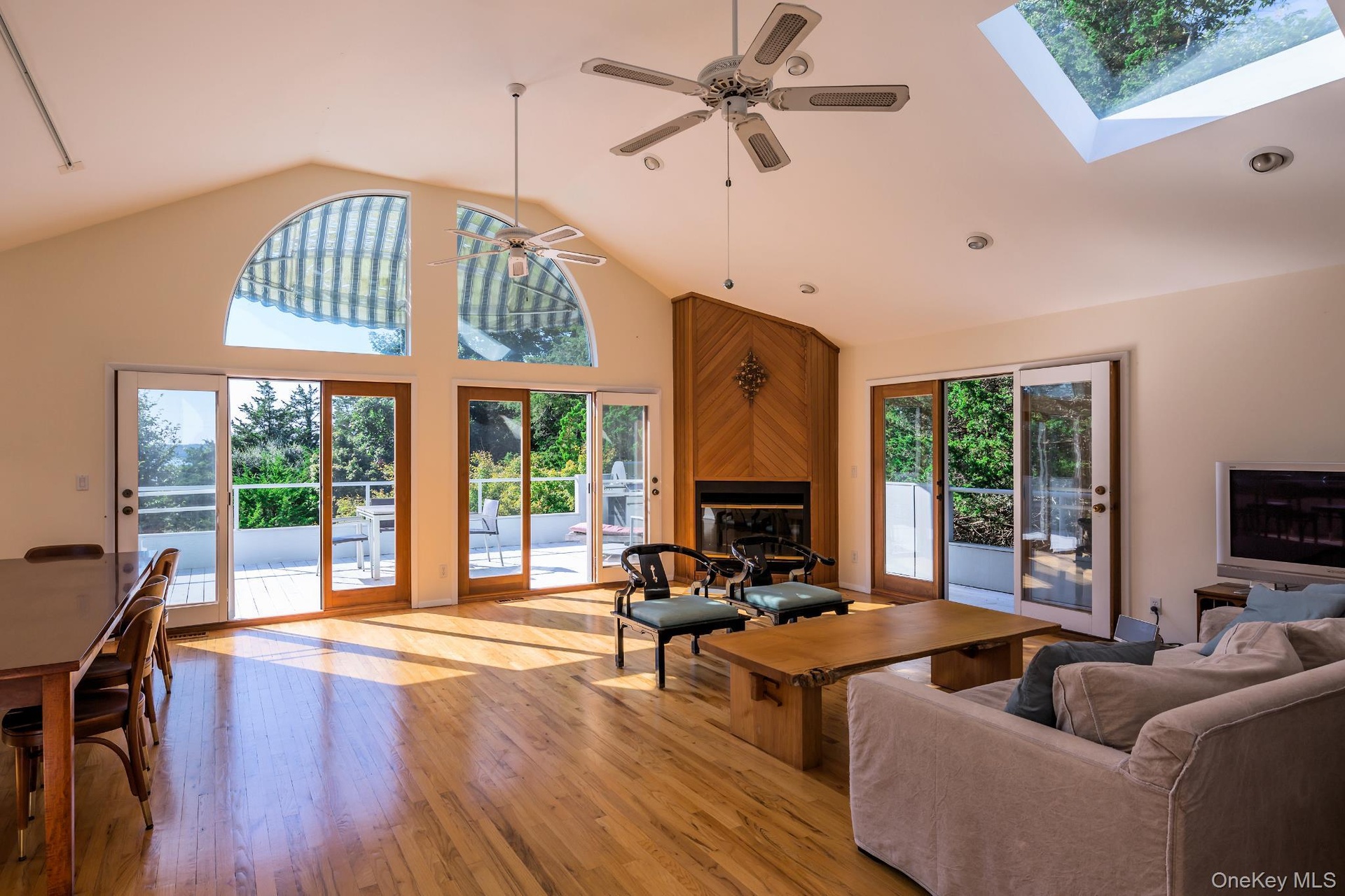 - Living room with high vaulted ceiling, light wood-style flooring, a fireplace, a skylight, and ceiling fan