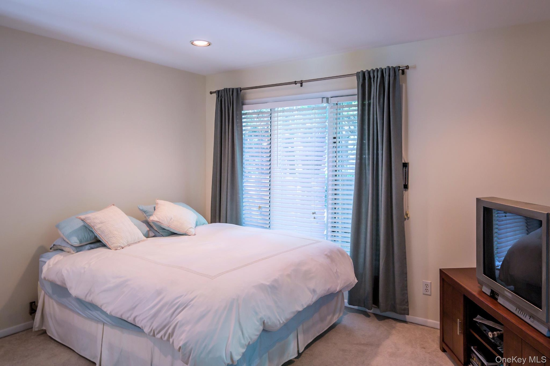 - Bedroom featuring light carpet and recessed lighting