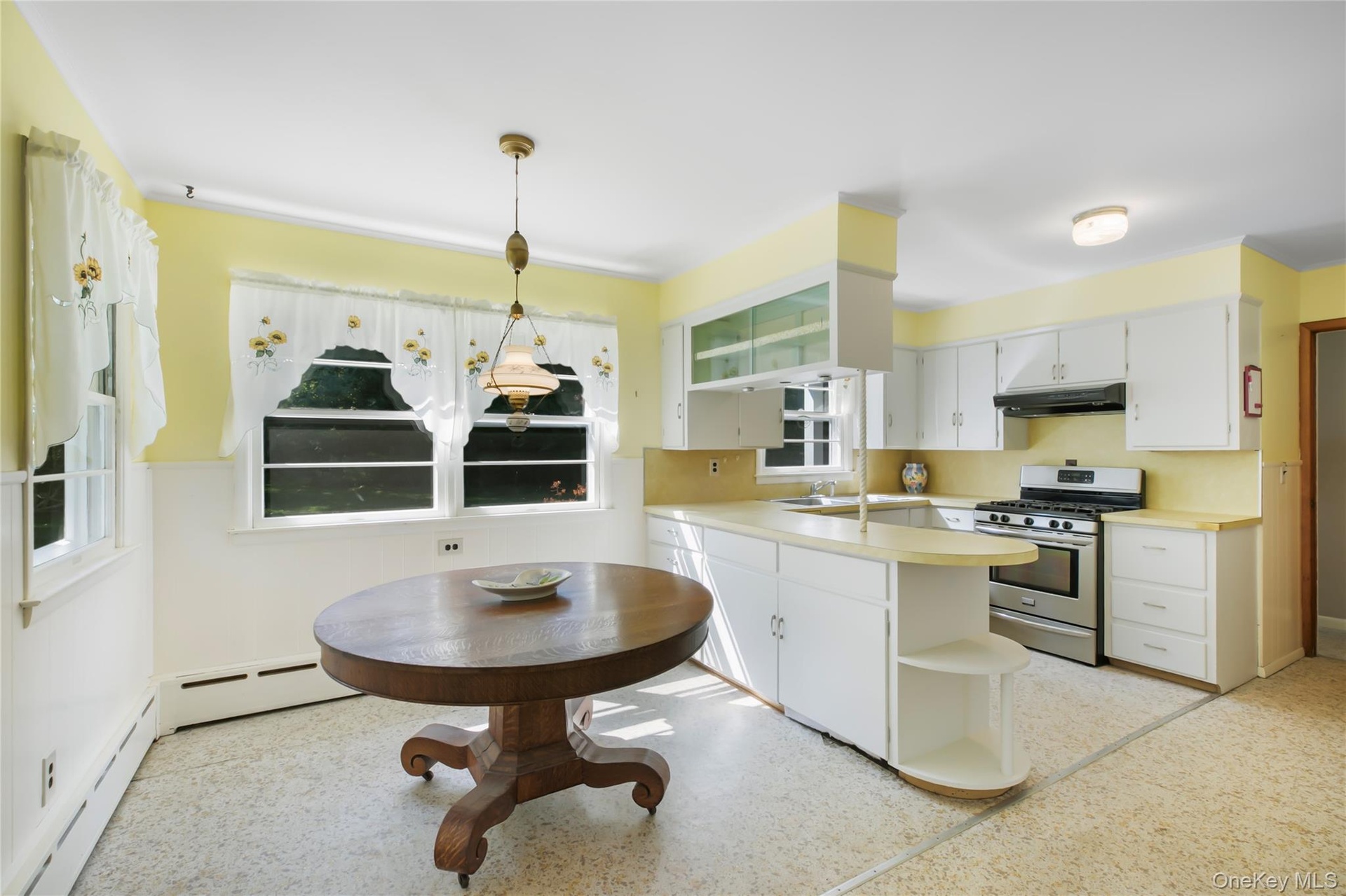 - Kitchen featuring light countertops, gas range, pendant lighting, a peninsula, and open shelves