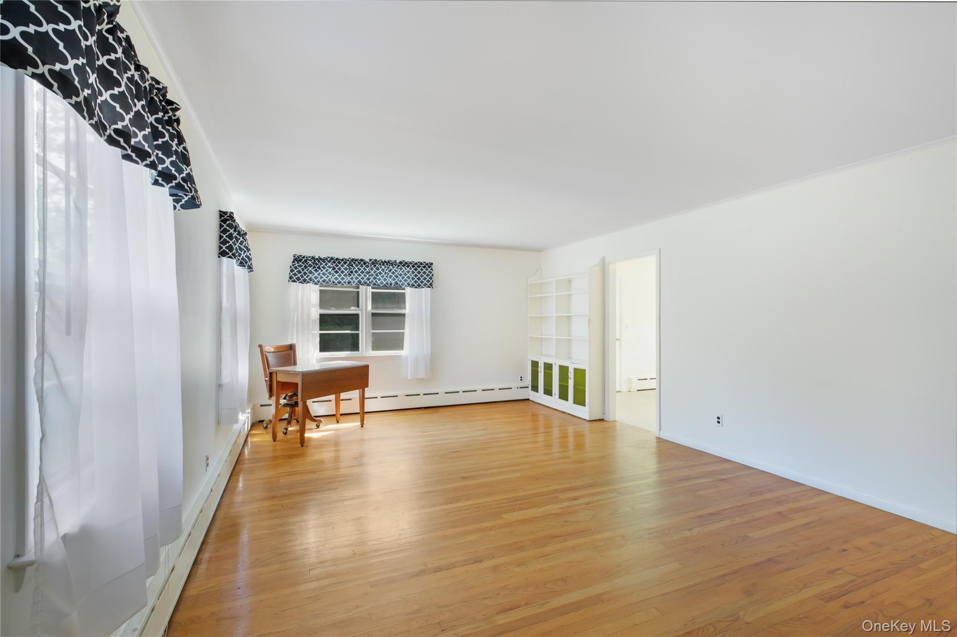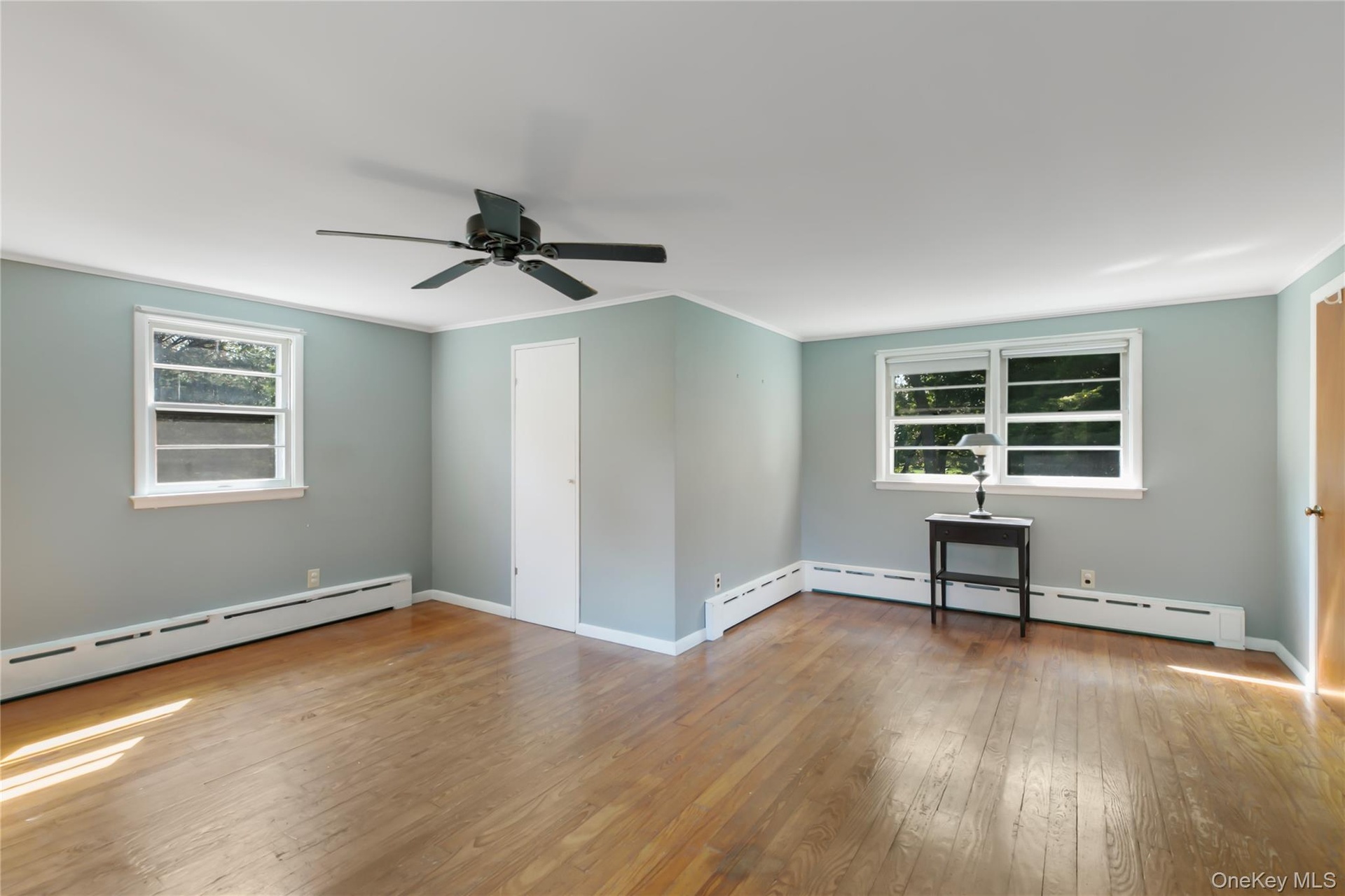 - Spare room with wood finished floors, plenty of natural light, ornamental molding, and baseboard heating
