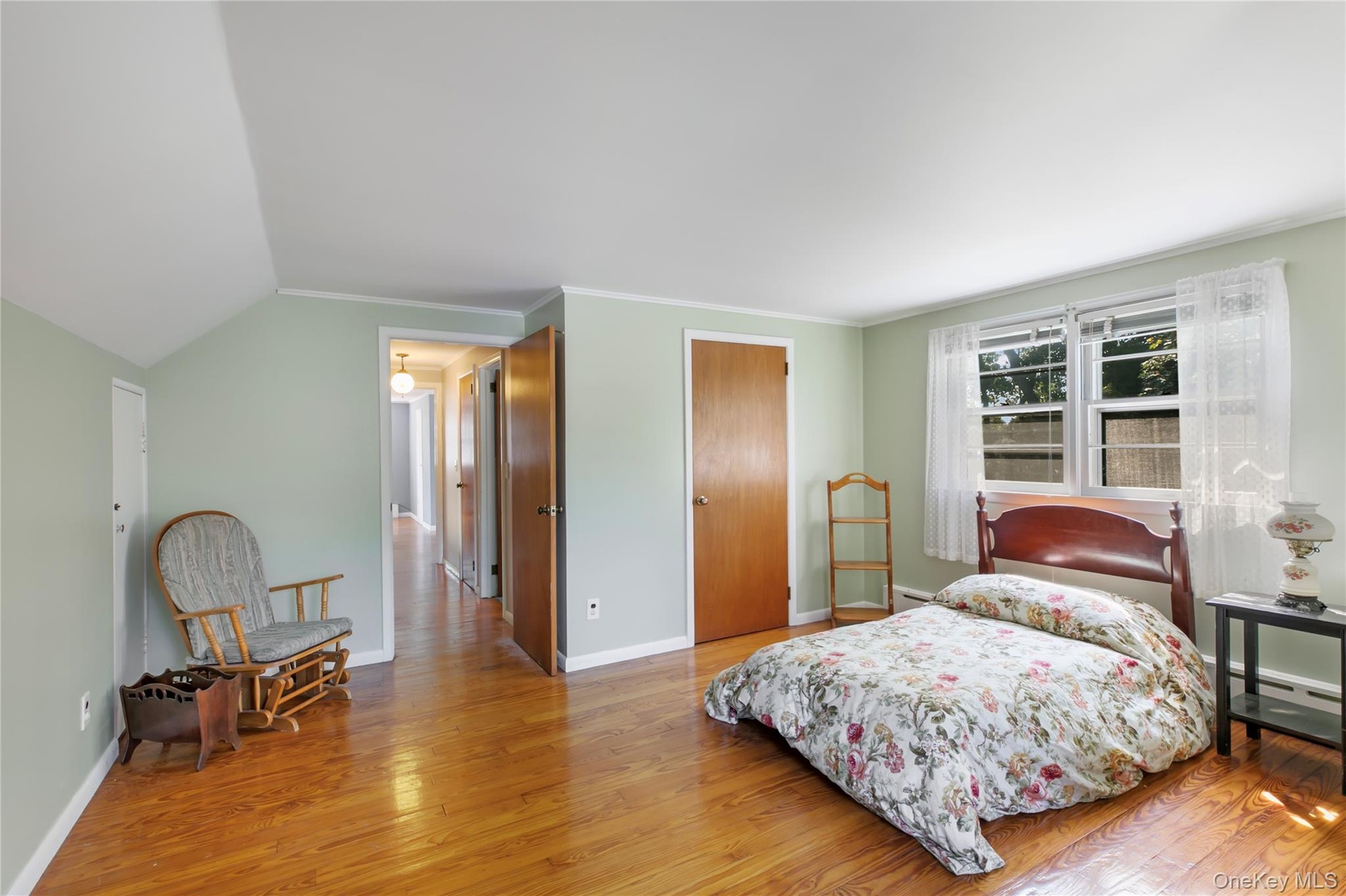 - Bedroom featuring wood finished floors, a closet, and ornamental molding