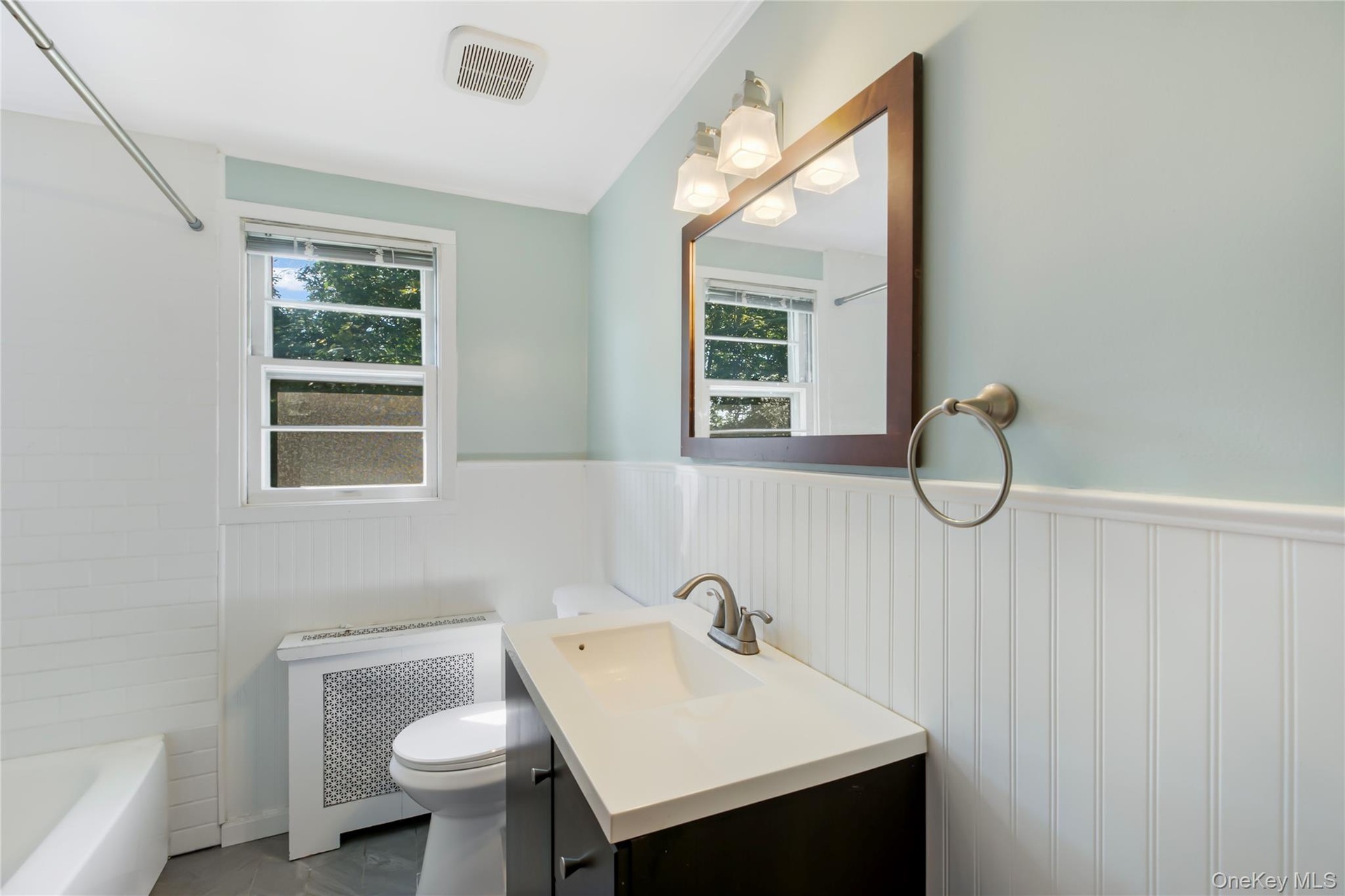 - Full bath with radiator, a wainscoted wall, vanity, plenty of natural light, and shower / bathtub combination