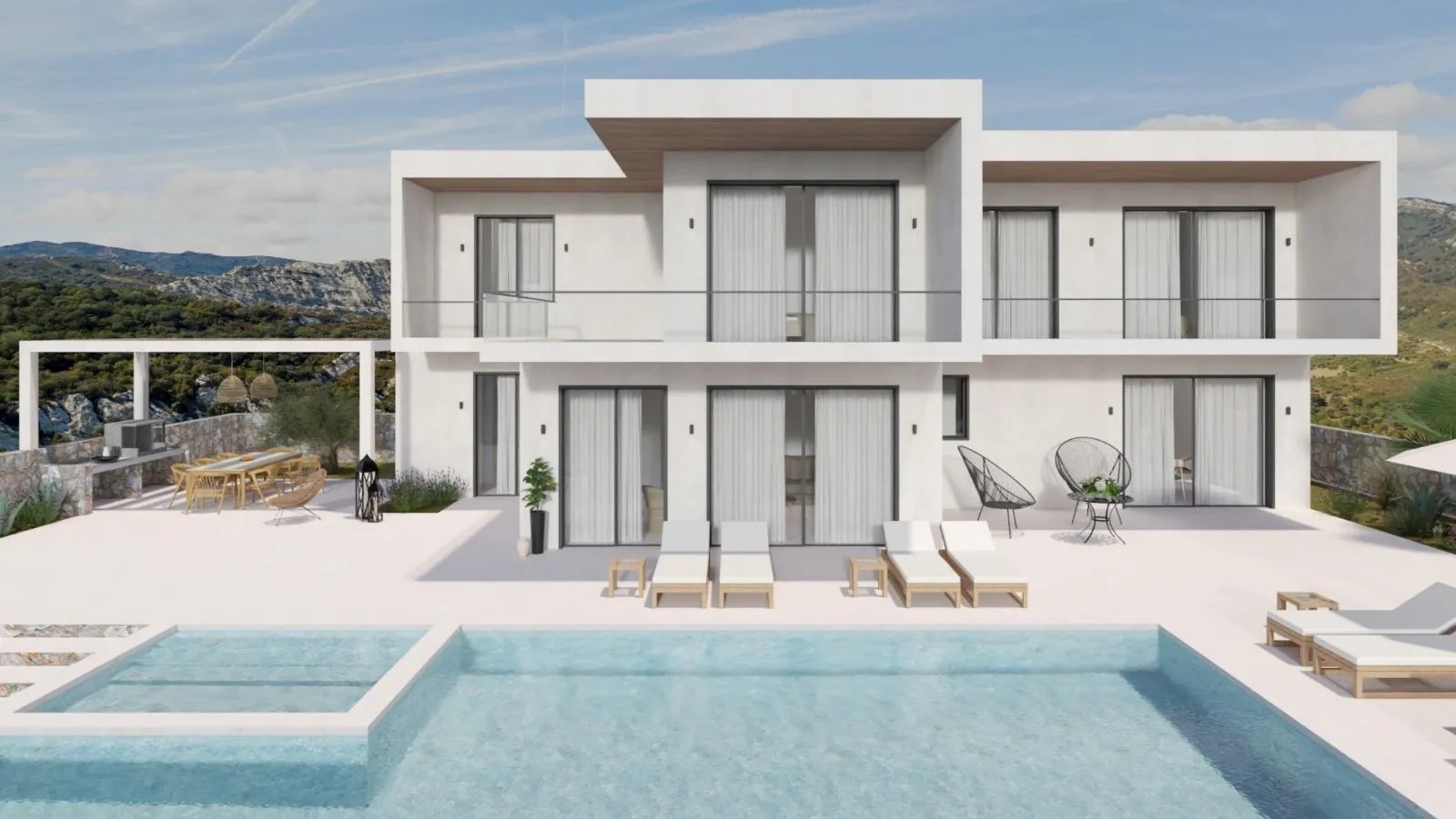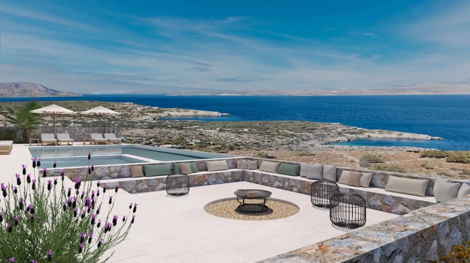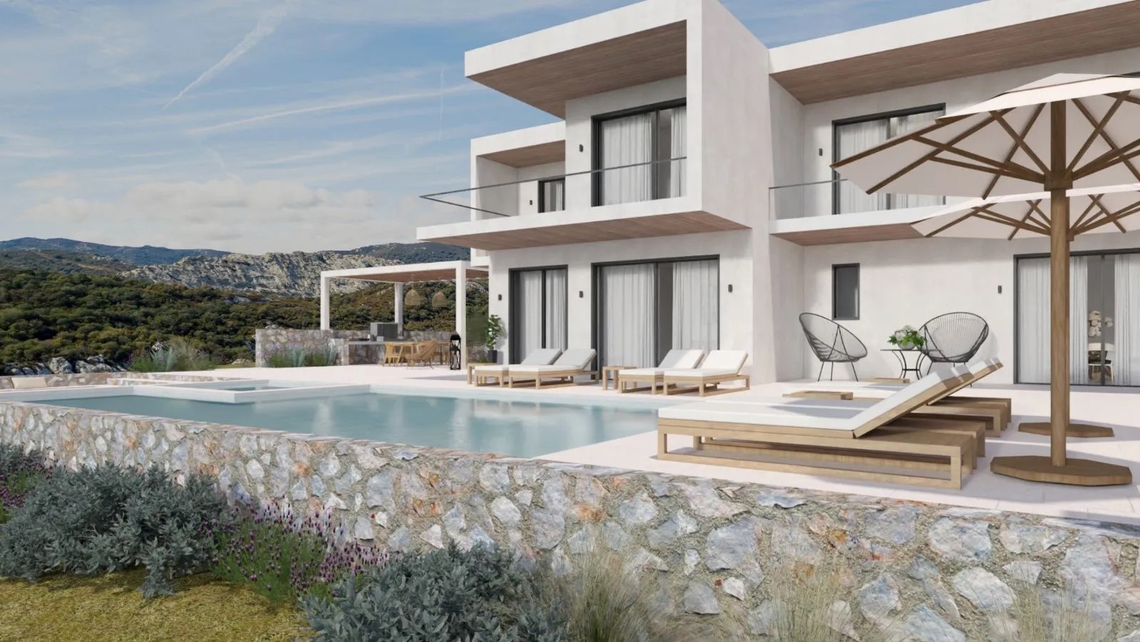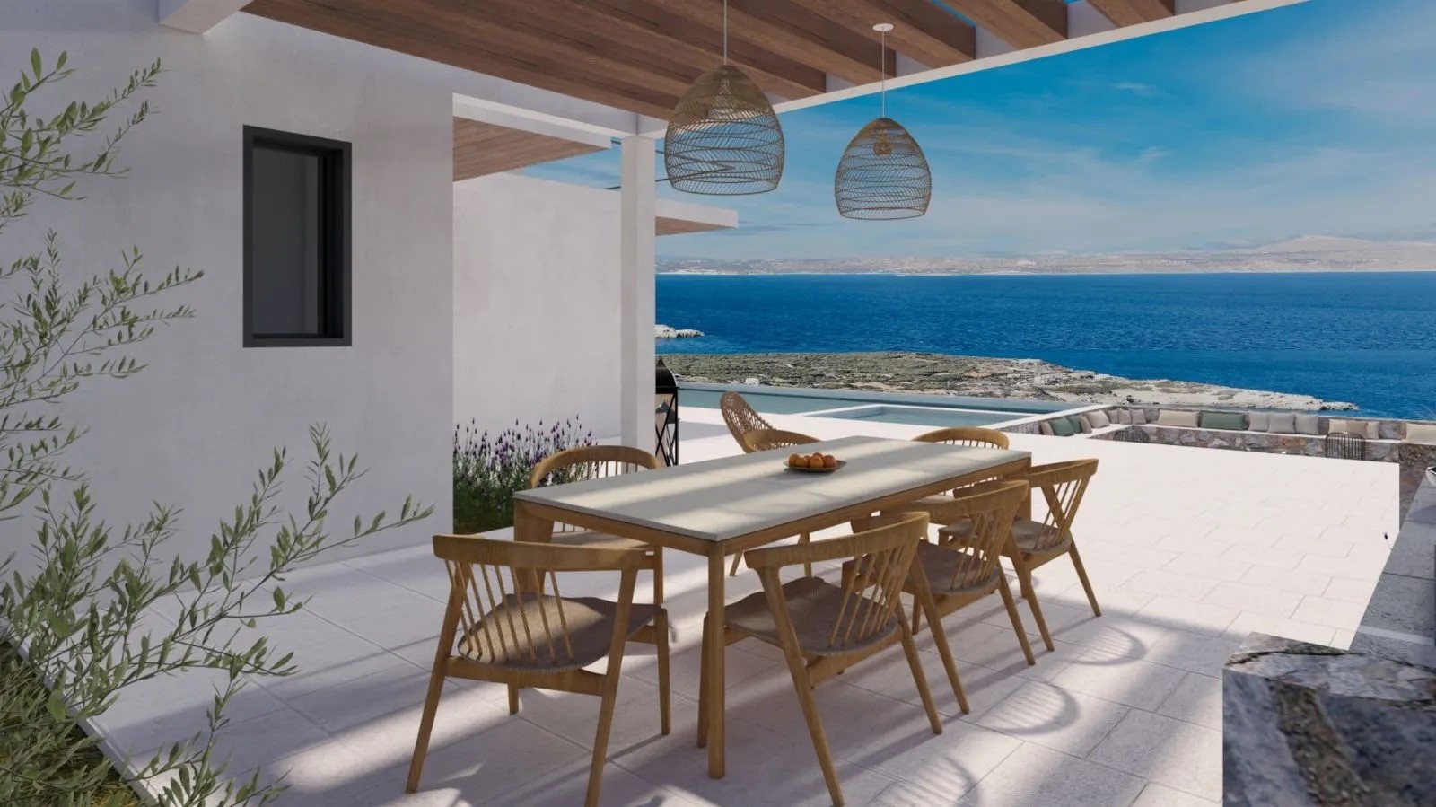 Located in the tranquil village of Kokkino Chorio, this newly designed villa offers a refined living experience with uninterrupted views of the sea and surrounding landscape.