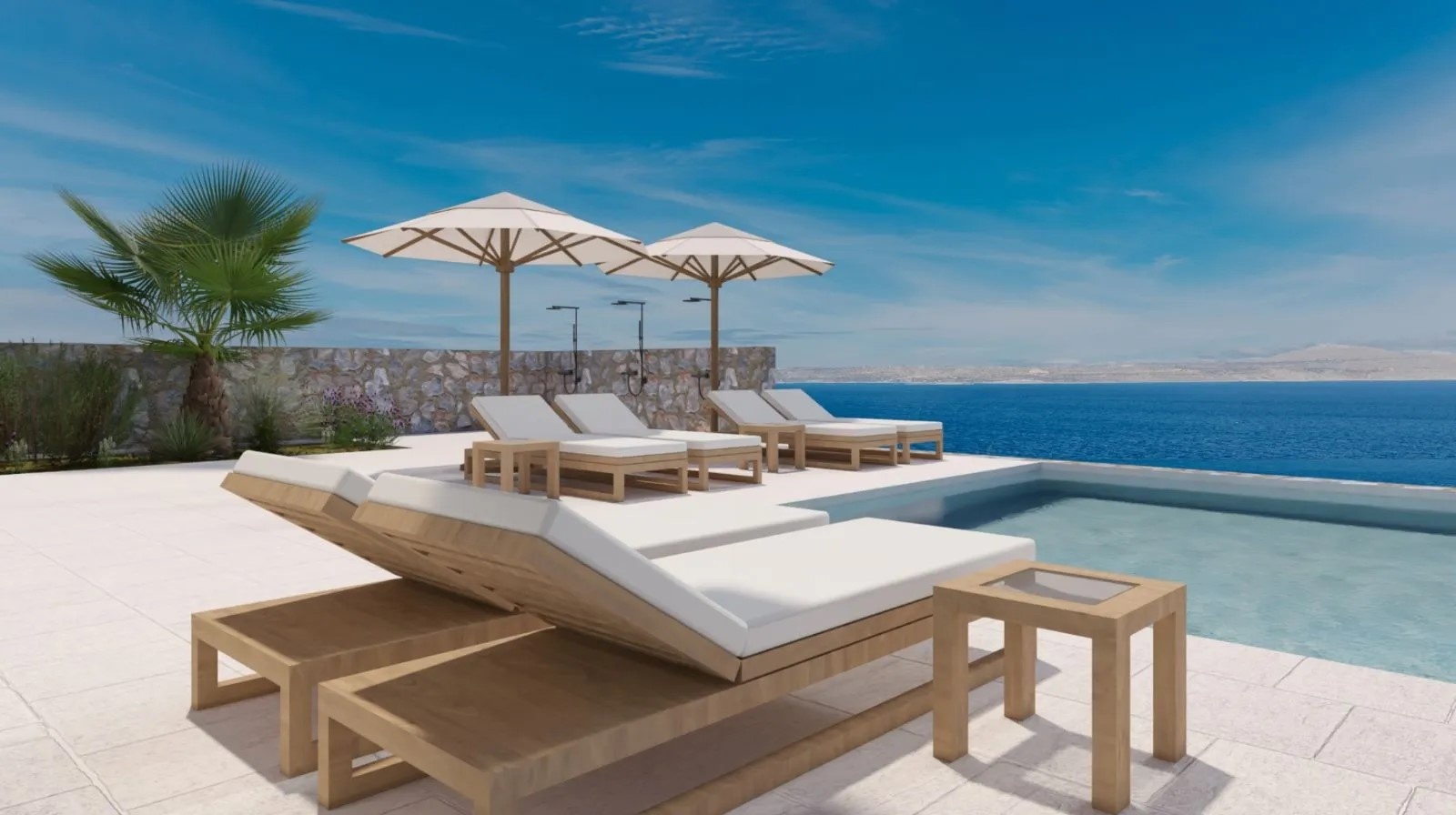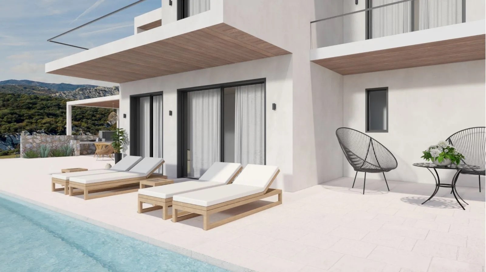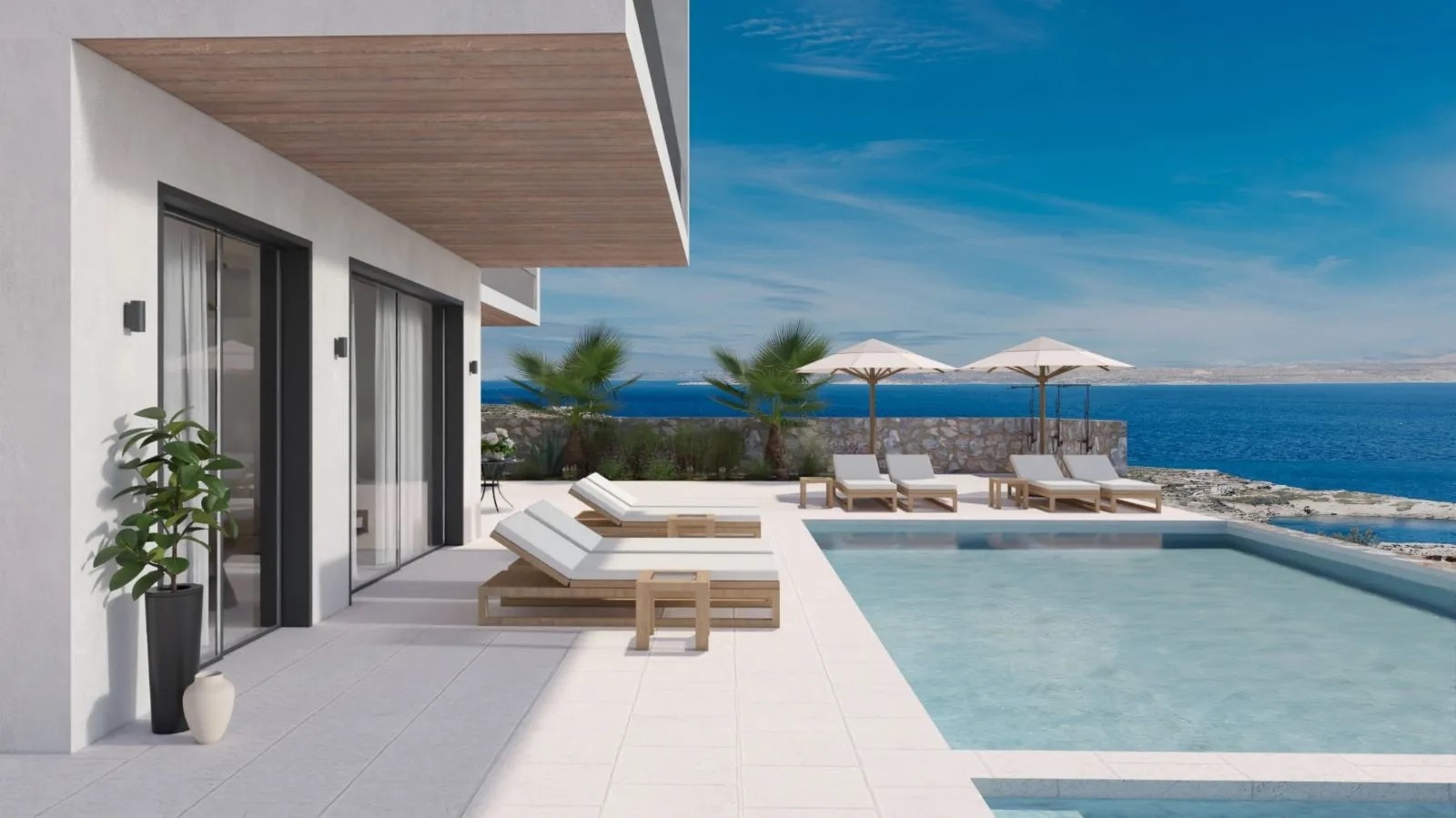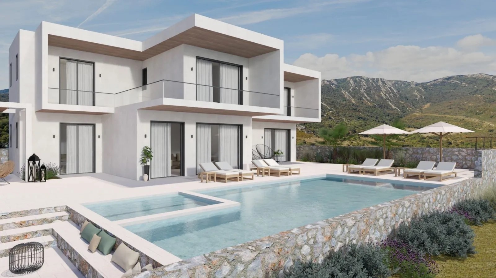 Located in the tranquil village of Kokkino Chorio, this newly designed villa offers a refined living experience with uninterrupted views of the sea and surrounding landscape.