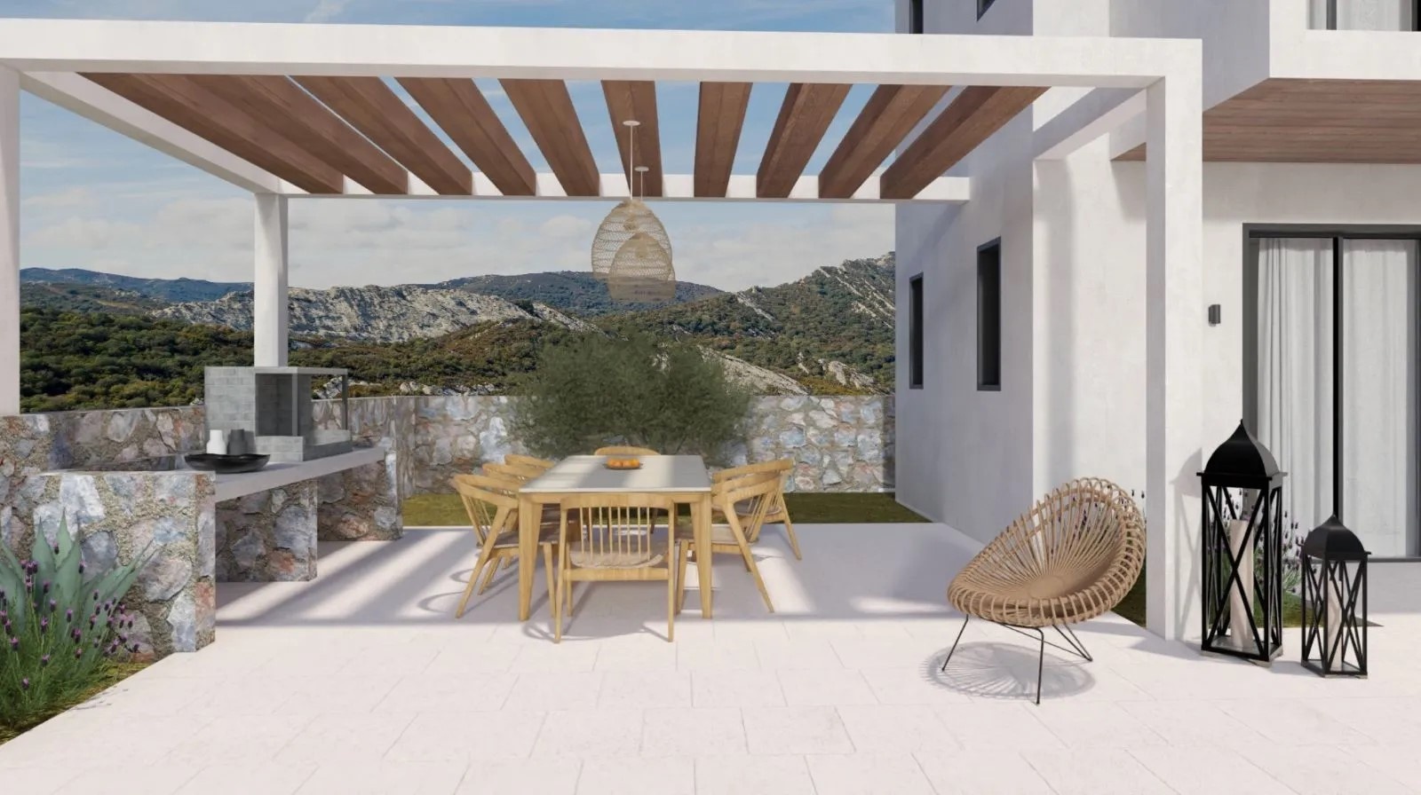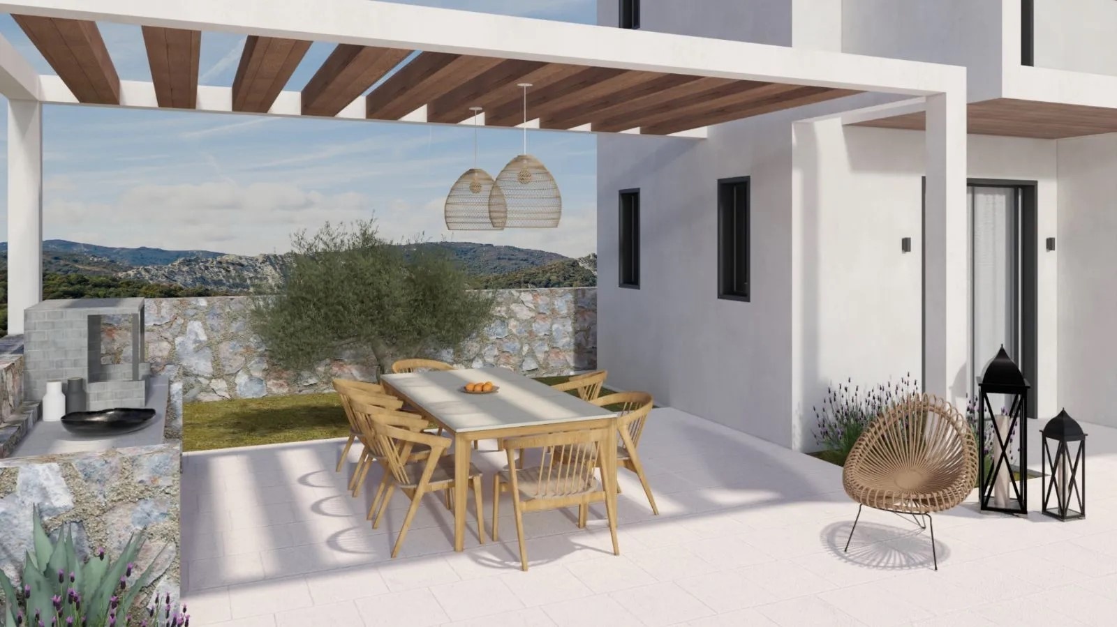 The villa spans a total internal net area of 186 m2, with five bedrooms and five bathrooms, all thoughtfully laid out to provide privacy and comfort for residents and guests alike. Including balconies and covered areas, the total internal footprint expands to 222 m2. The house sits on a generous plot of 4,106 m2, allowing for open views and outdoor living space without compromise.