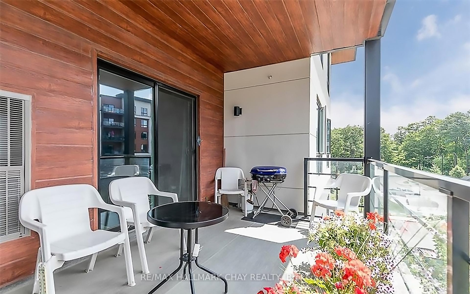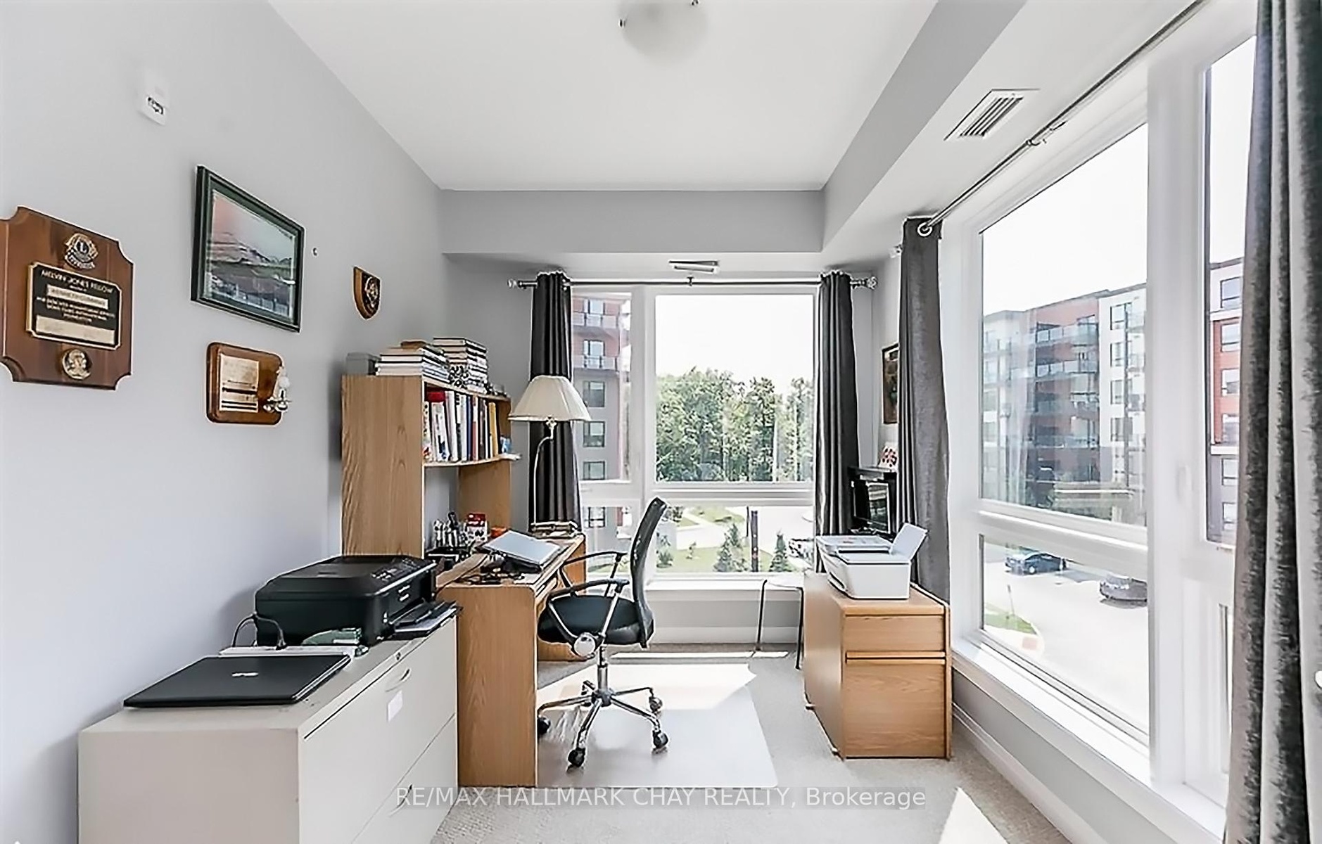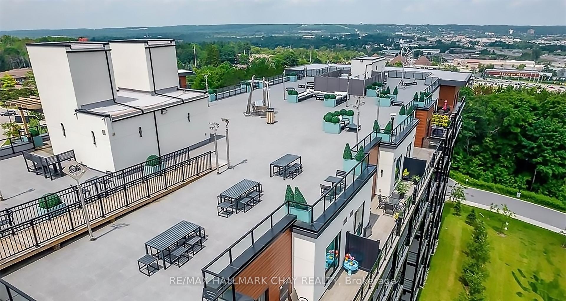 Welcome to the Gallery condo community! Making the switch to condo living has never been so easy! Enjoy this care-free condo lifestyle - no mowing lawns, shoveling driveways! This popular and sought-after corner condo unit is bright with natural light via additional windows. The floor plan for this 1,454 sq.ft. corner suite features 9' ceilings, open concept with an abundance of functional living space, walk out to premium large, covered, wrap-around balcony, as well as primary bedroom, another spacious bedroom + flex space of the den, two full baths. Convenience of ensuite laundry, BBQs allowed on your balcony (2.34m x 4.37m). You will appreciate TWO PARKING SPOTS - 1 indoor & 1 outdoor, plus a storage locker. This building offers one of the best roof top patios around - al fresco dining, entertaining, summer morning coffee dates, evening wrap up & chill time. Steps to trails for hiking, biking, easy access to key amenities - shopping, services, casual and fine dining, entertainment and recreation. Commuting? Public transit, GO Train service and great highway access north to cottage country or south to the GTA. Welcome to the convenience condo lifestyle has to offer. Take a look today!
