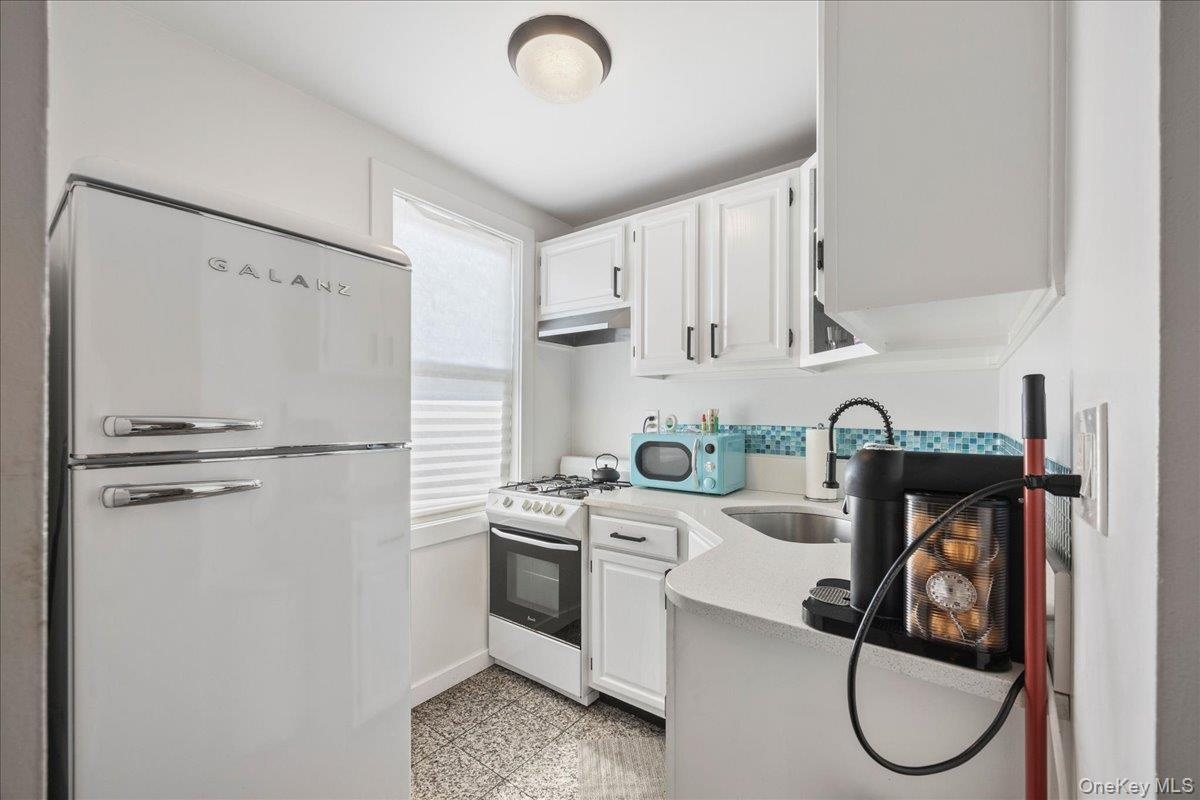 - Kitchen featuring freestanding refrigerator, white cabinets, range with gas cooktop, light stone counters, and under cabinet range hood