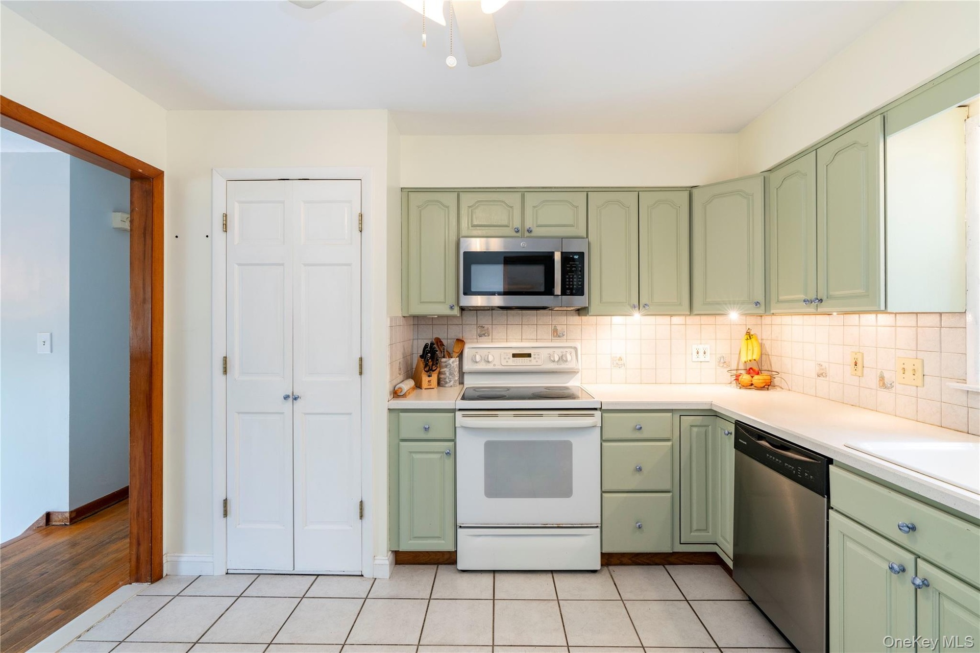 - Kitchen featuring light countertops, stainless steel dishwasher & microwave and green cabinetry