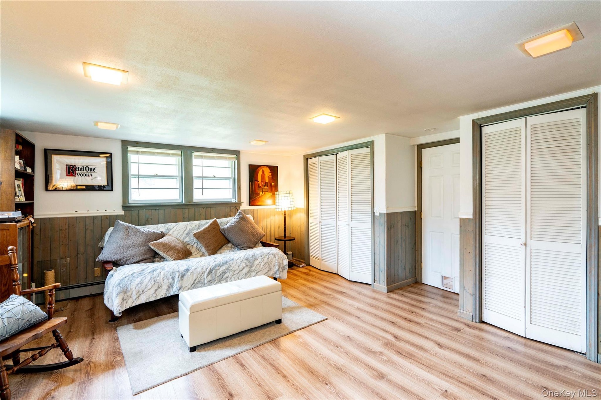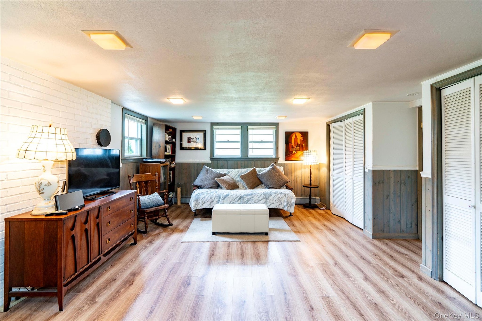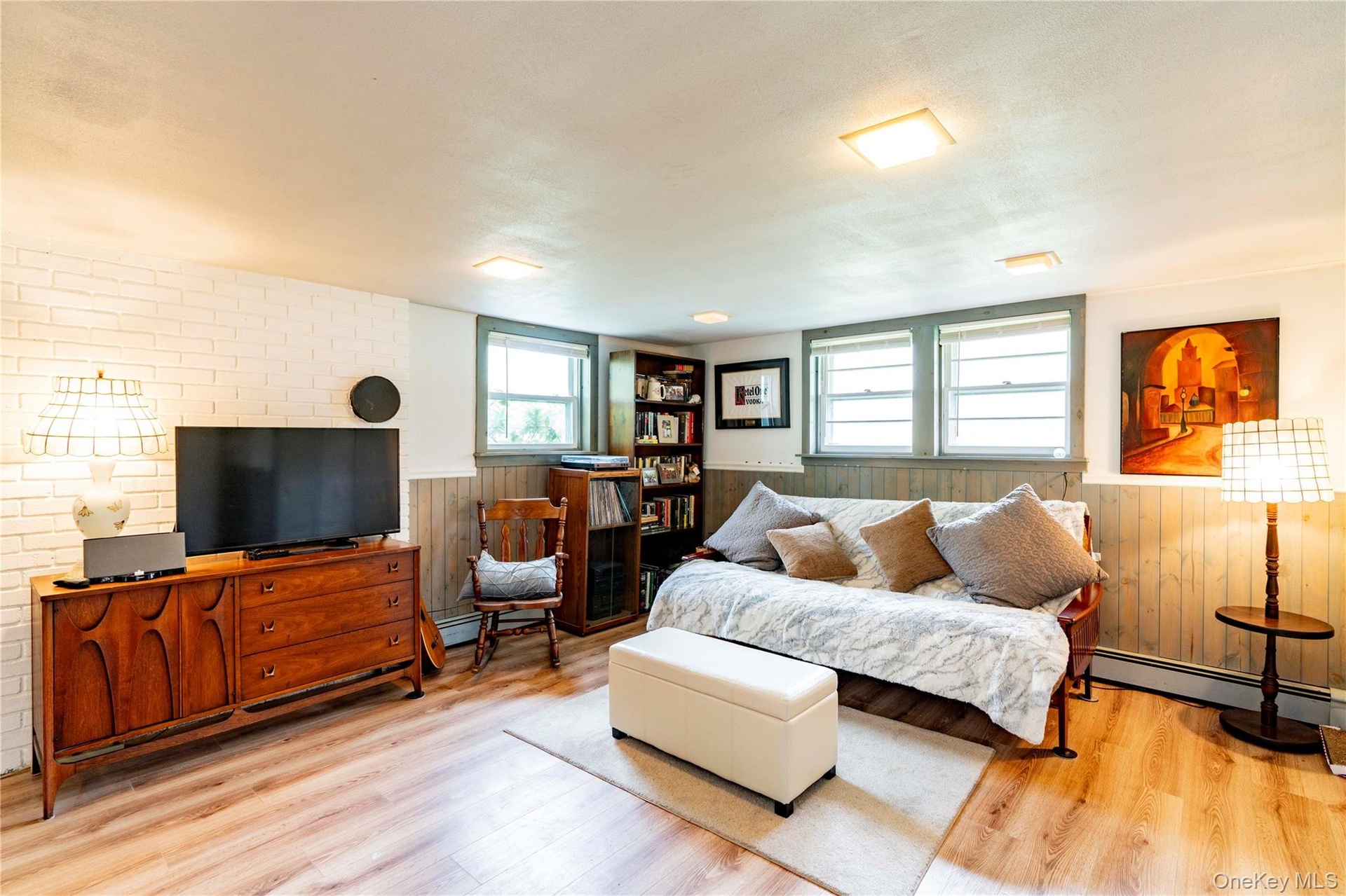 - Family room featuring two closets, brick wall, baseboard heating, light wood-type flooring