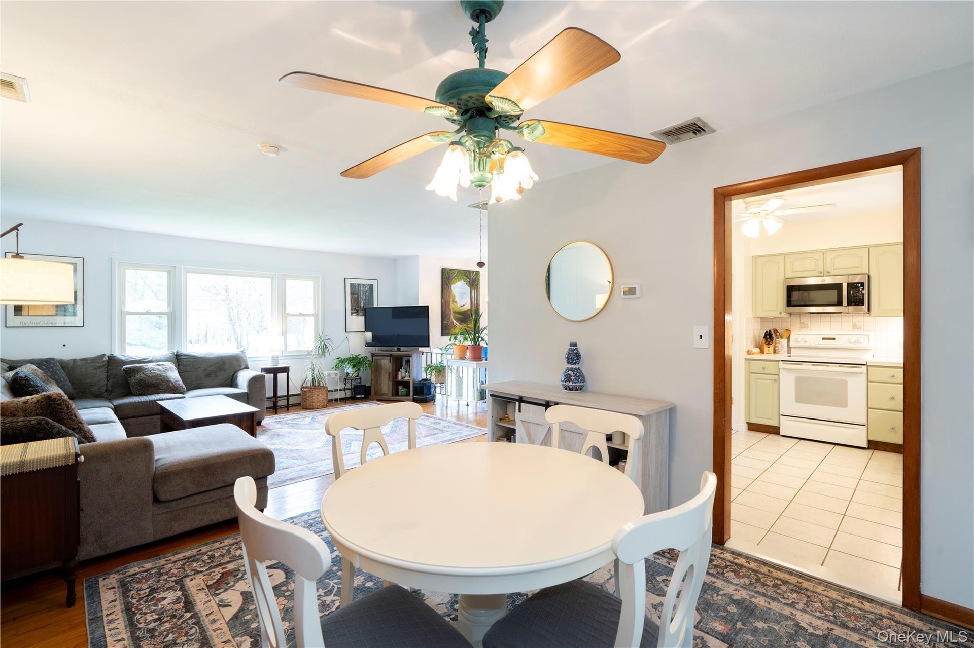 - Dining room with ceiling fan, baseboard heat, and hard wood floors