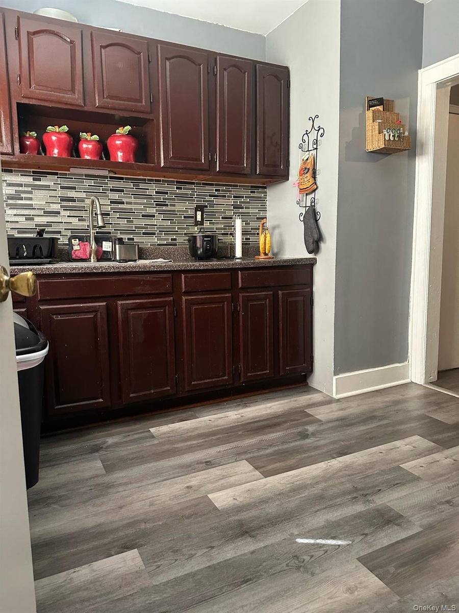 - Bar area with open shelves, tasteful backsplash, dark wood finished floors, dark brown cabinetry, and dark stone counters