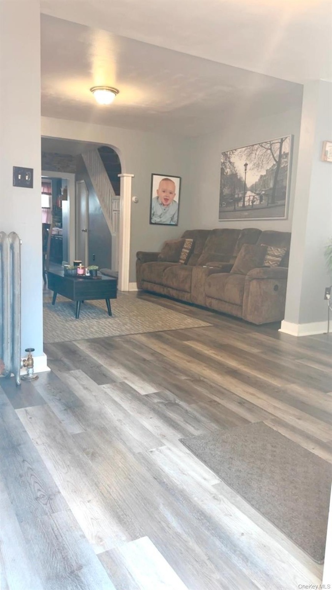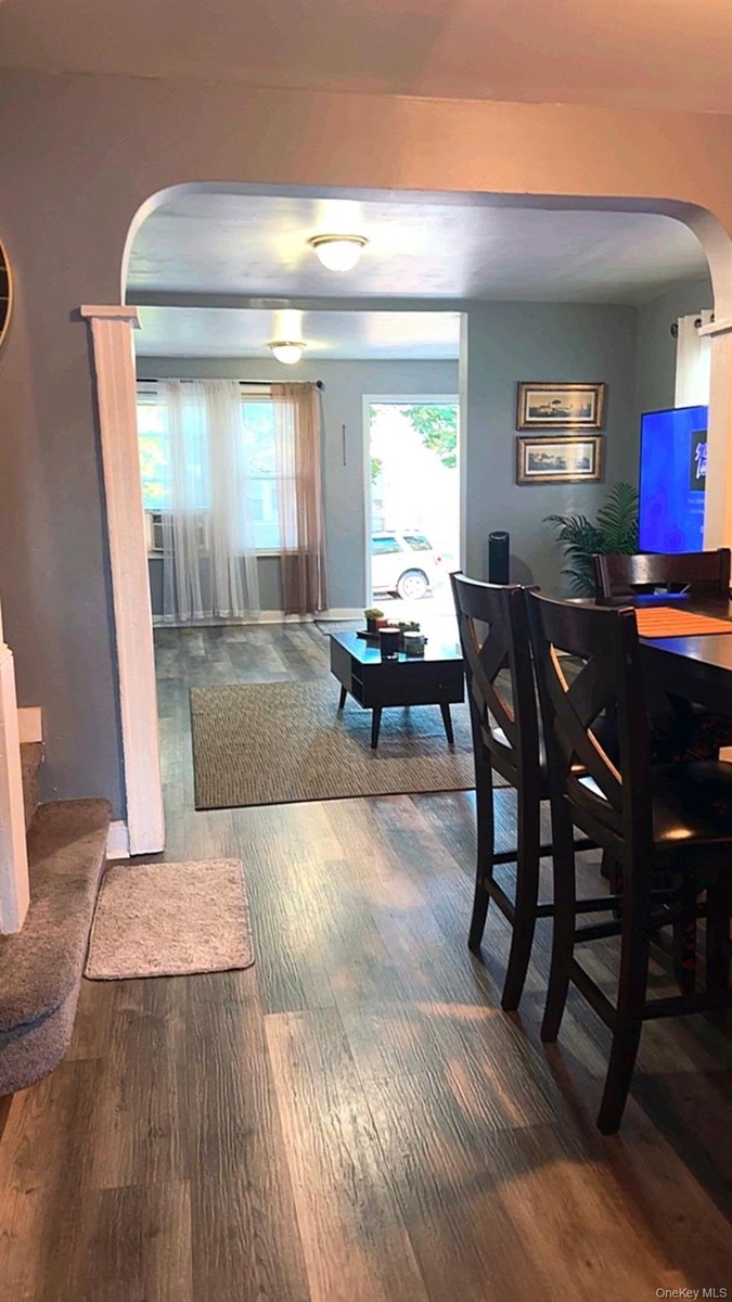 - Dining area featuring arched walkways, wood finished floors, and stairway