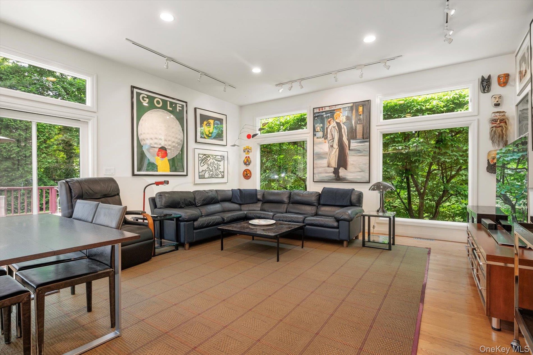 - Living area featuring light wood-type flooring, a high ceiling, and rail lighting