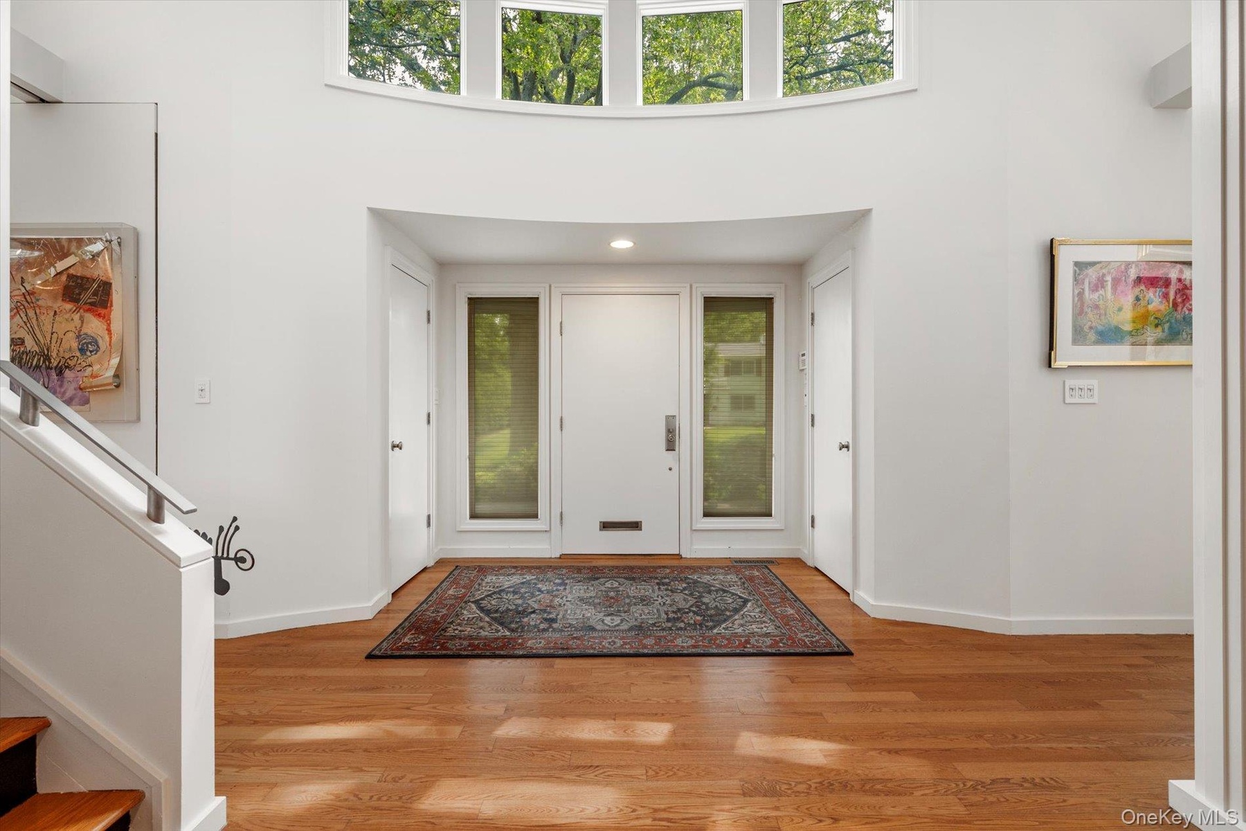 - Entryway with a towering ceiling, wood finished floors, and stairway