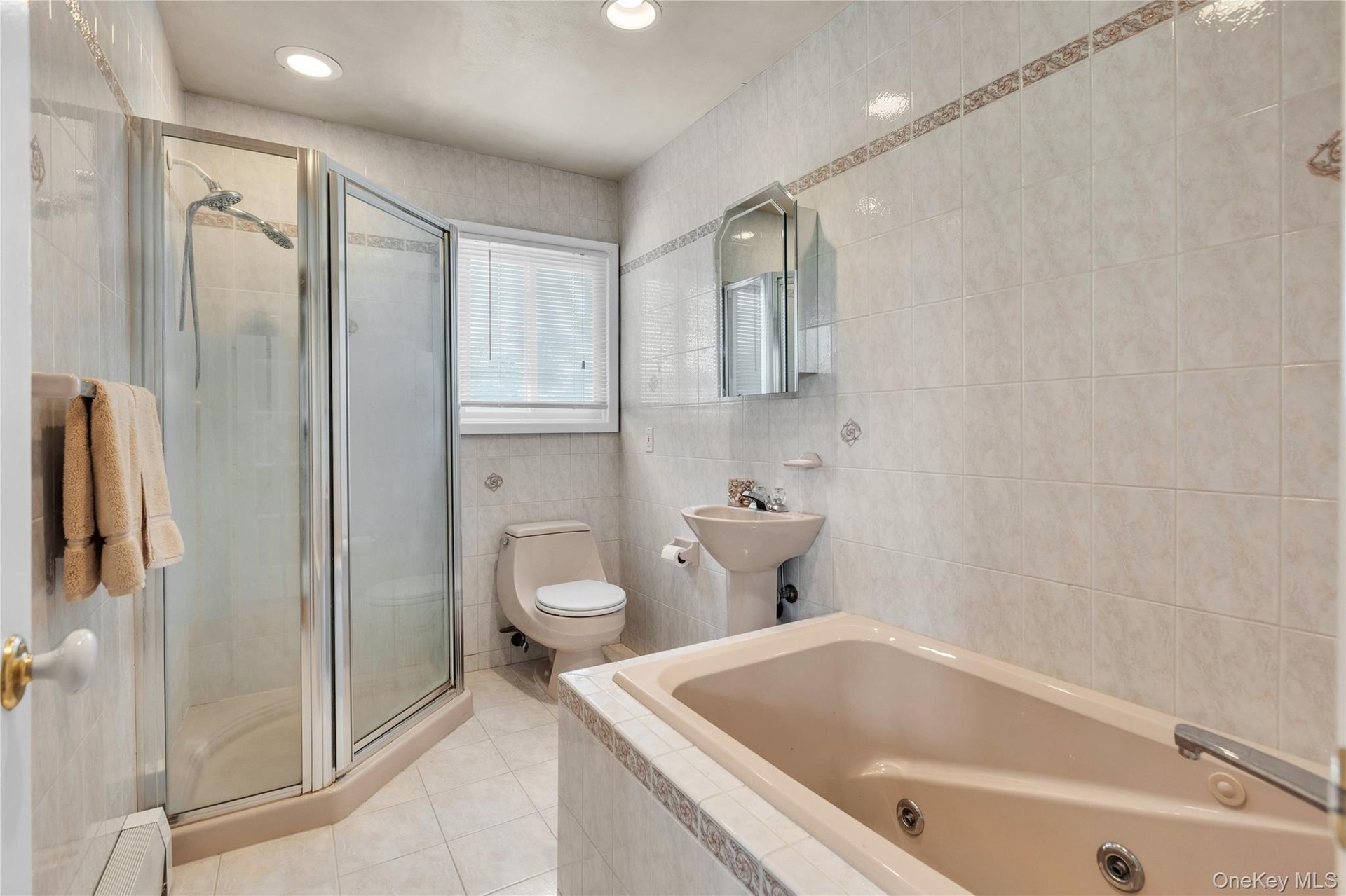 - Full bathroom featuring tile walls, a stall shower, a tub with jets, light tile patterned flooring, and recessed lighting