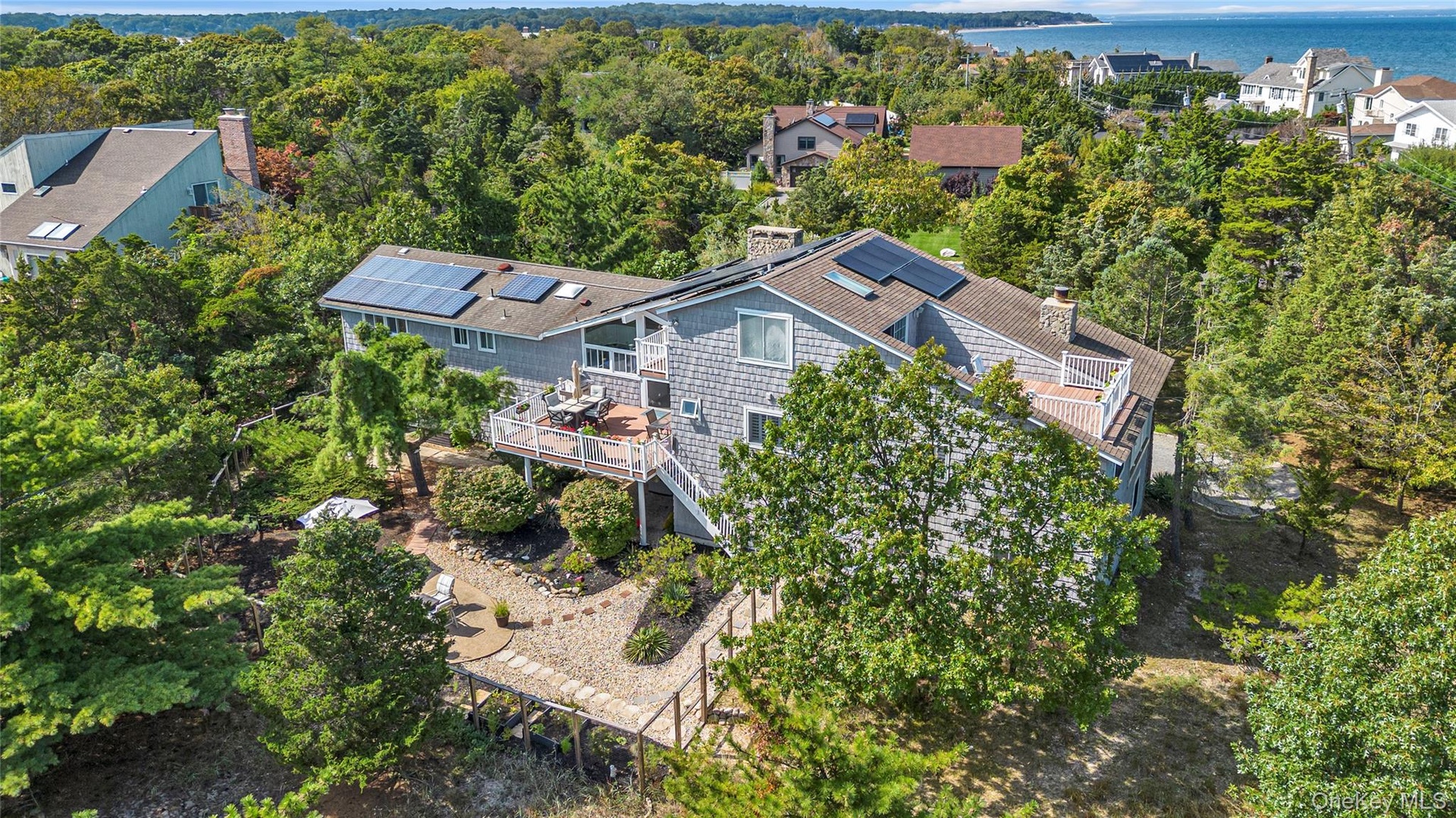 - Drone / aerial view of a heavily wooded area and a large body of water