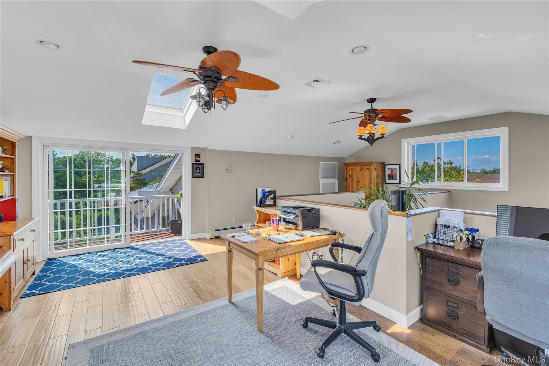 - Office area featuring a skylight, ceiling fan, light wood-style flooring, lofted ceiling, and recessed lighting. Access to deck and wodnerful watervi