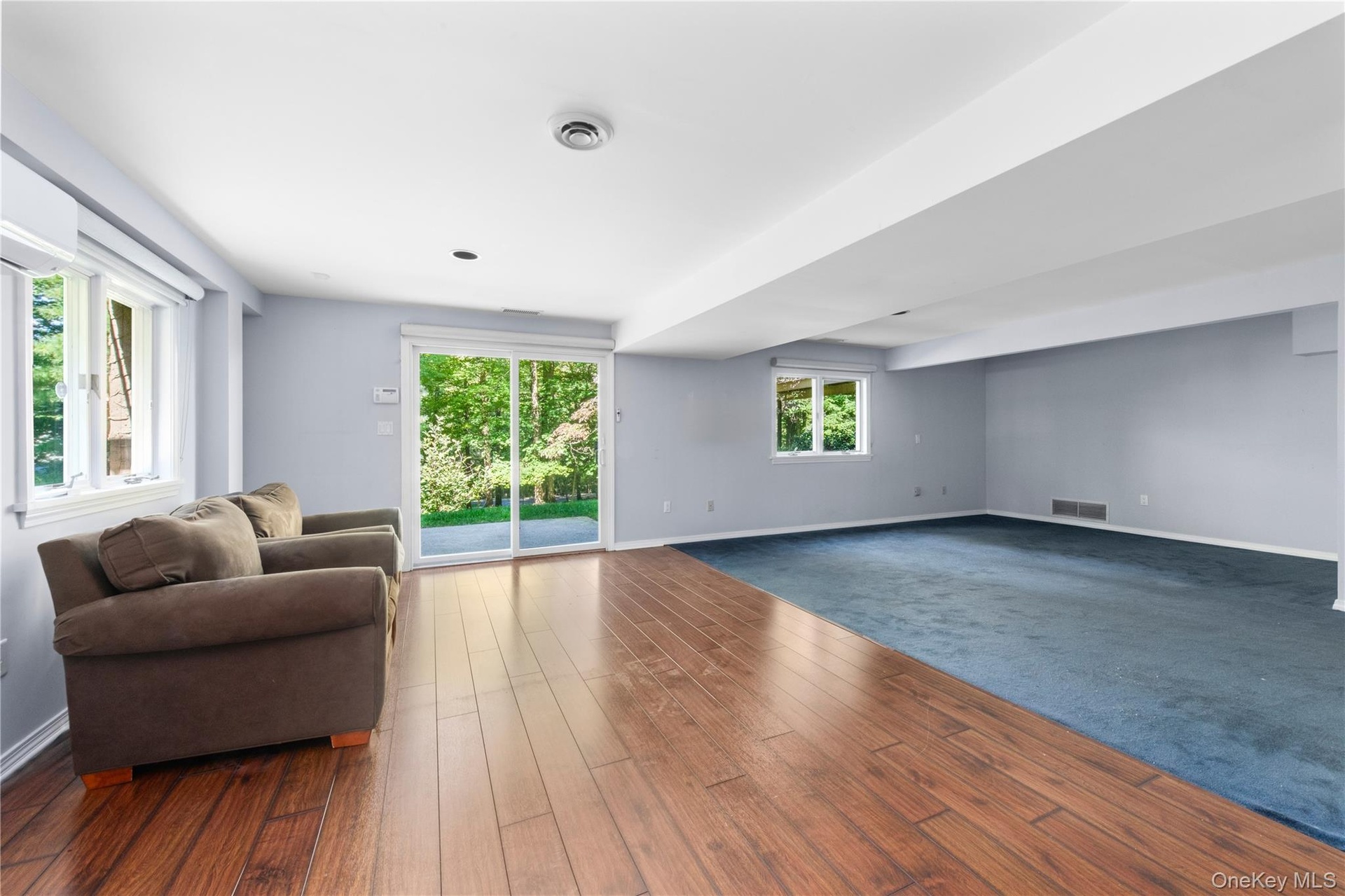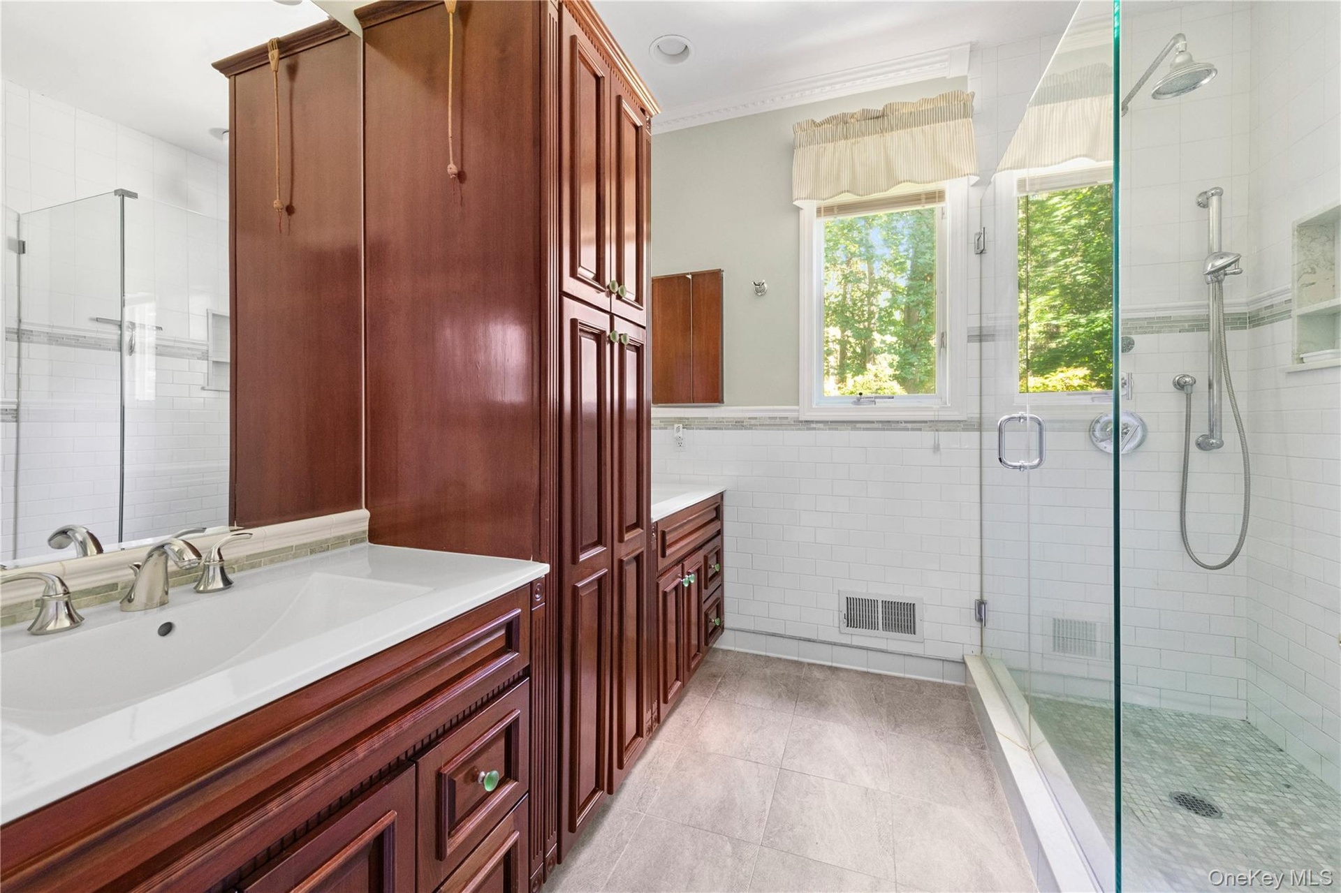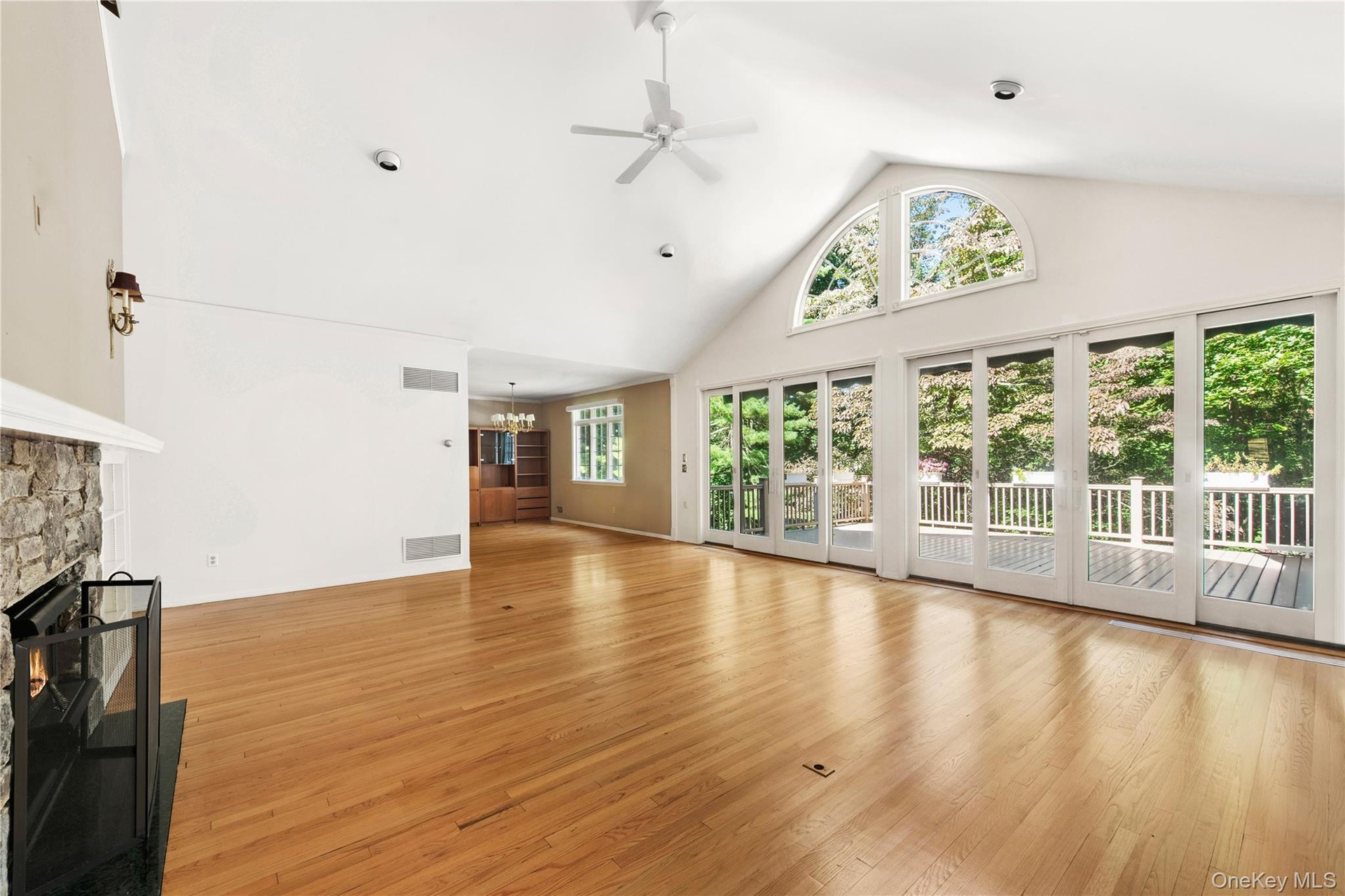 Set in one of Bedford Corners’ premier estate neighborhoods, this 4-bedroom, 4.5-bath Ranch combines modern comfort with timeless appeal. A welcoming foyer with a dramatic stone wall introduces the home, leading to a spacious living room with fireplace, soaring ceiling, hardwood floors, and walls of windows that flood the space with natural light. Sliding doors open to a large deck, creating seamless indoor-outdoor living. Conveniently located off the foyer, a guest bath with laundry adds everyday functionality.