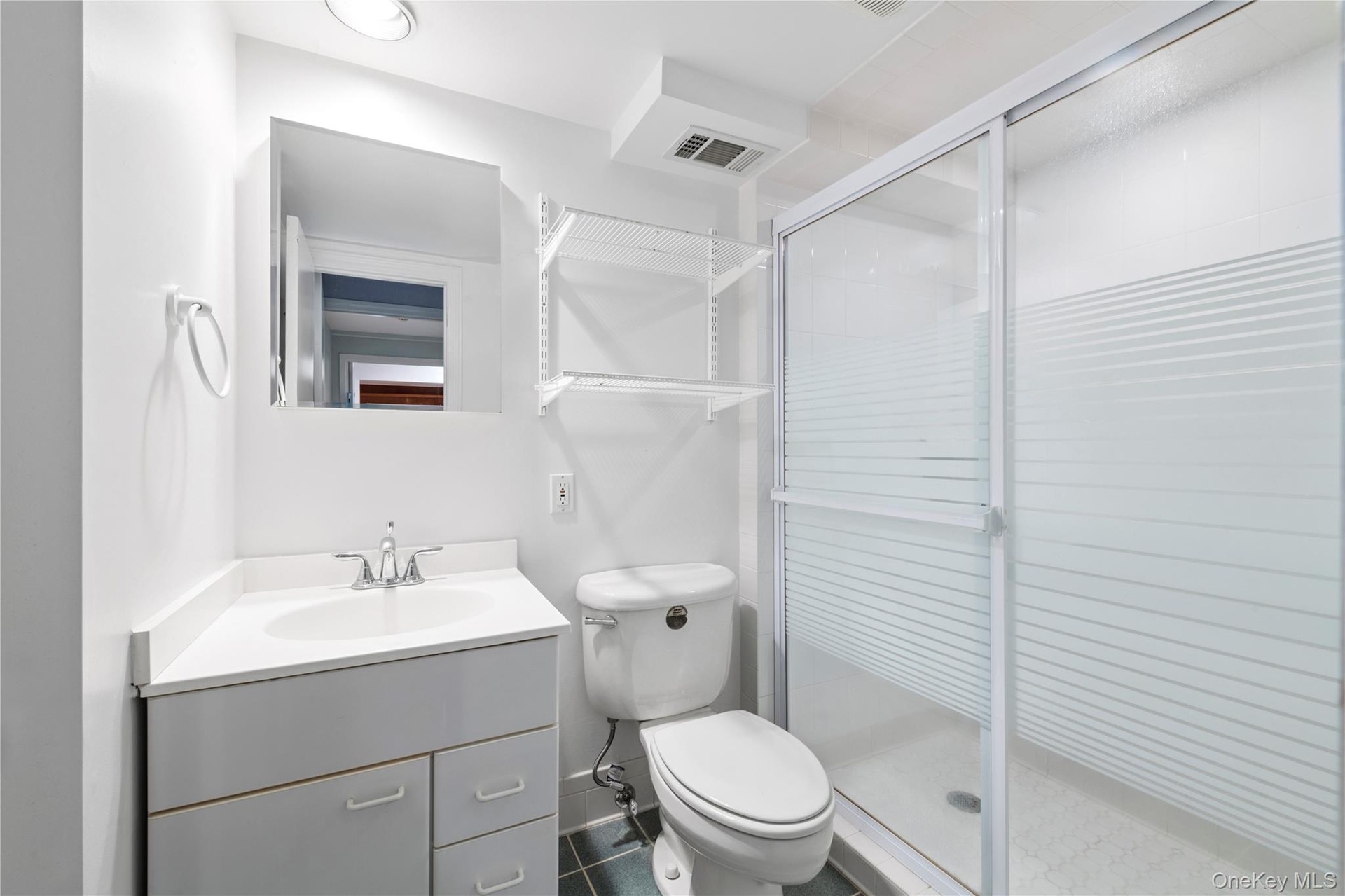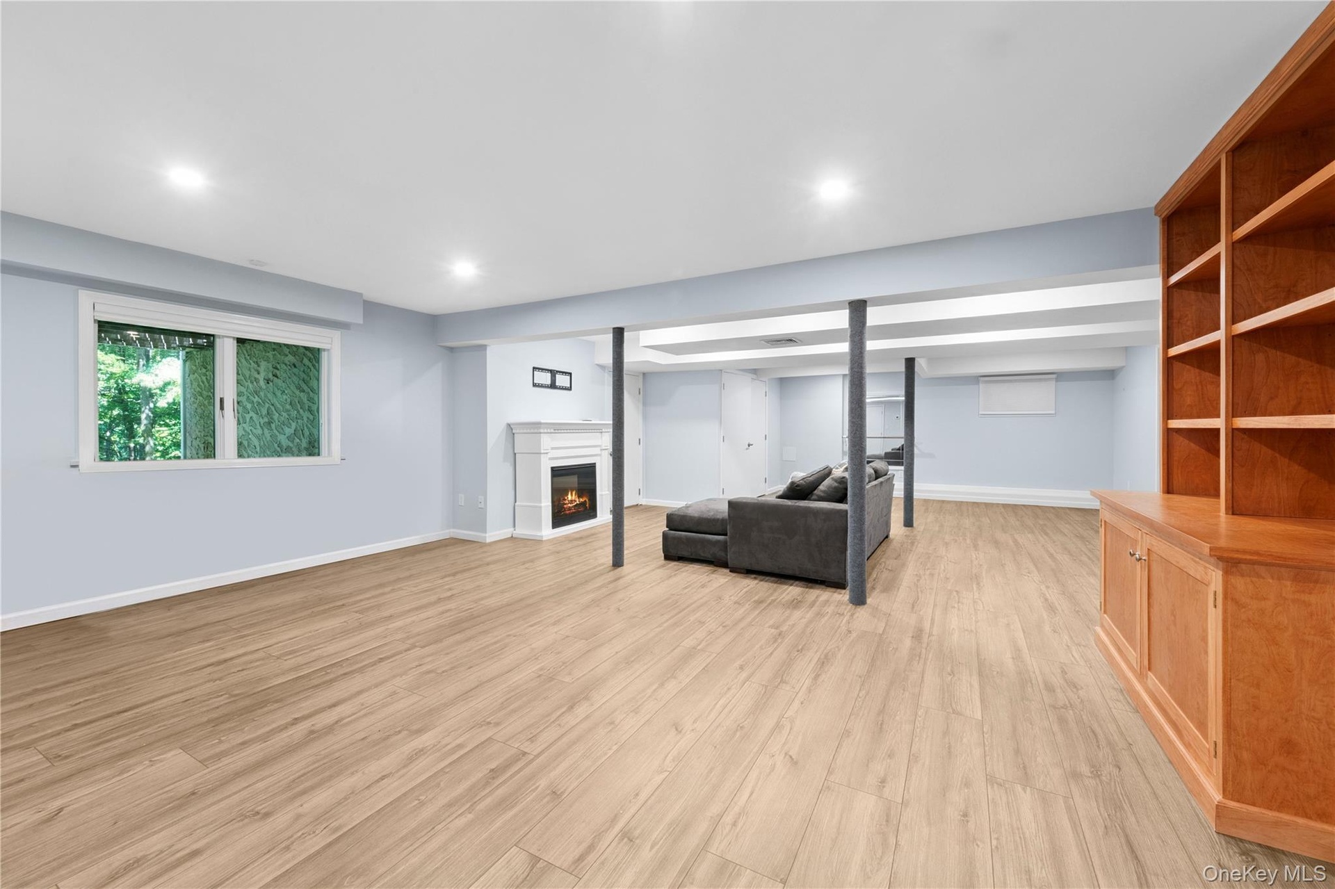 At the heart of the home, the beautifully renovated eat-in kitchen features white cabinetry, quartz counters, a subway tile backsplash, a professional 6-burner range, Sub-Zero refrigerator, and Bosch dishwasher. The adjacent family room, anchored by a stone-tile gas fireplace, TV, and a beverage center, opens seamlessly to a private deck through sliding glass doors. A spacious dining room with a wall of built-ins provides an inviting setting for entertaining. The main level also features two bedrooms, including a spacious primary suite with a renovated bath, walk-in closet, and sliders leading to the deck.