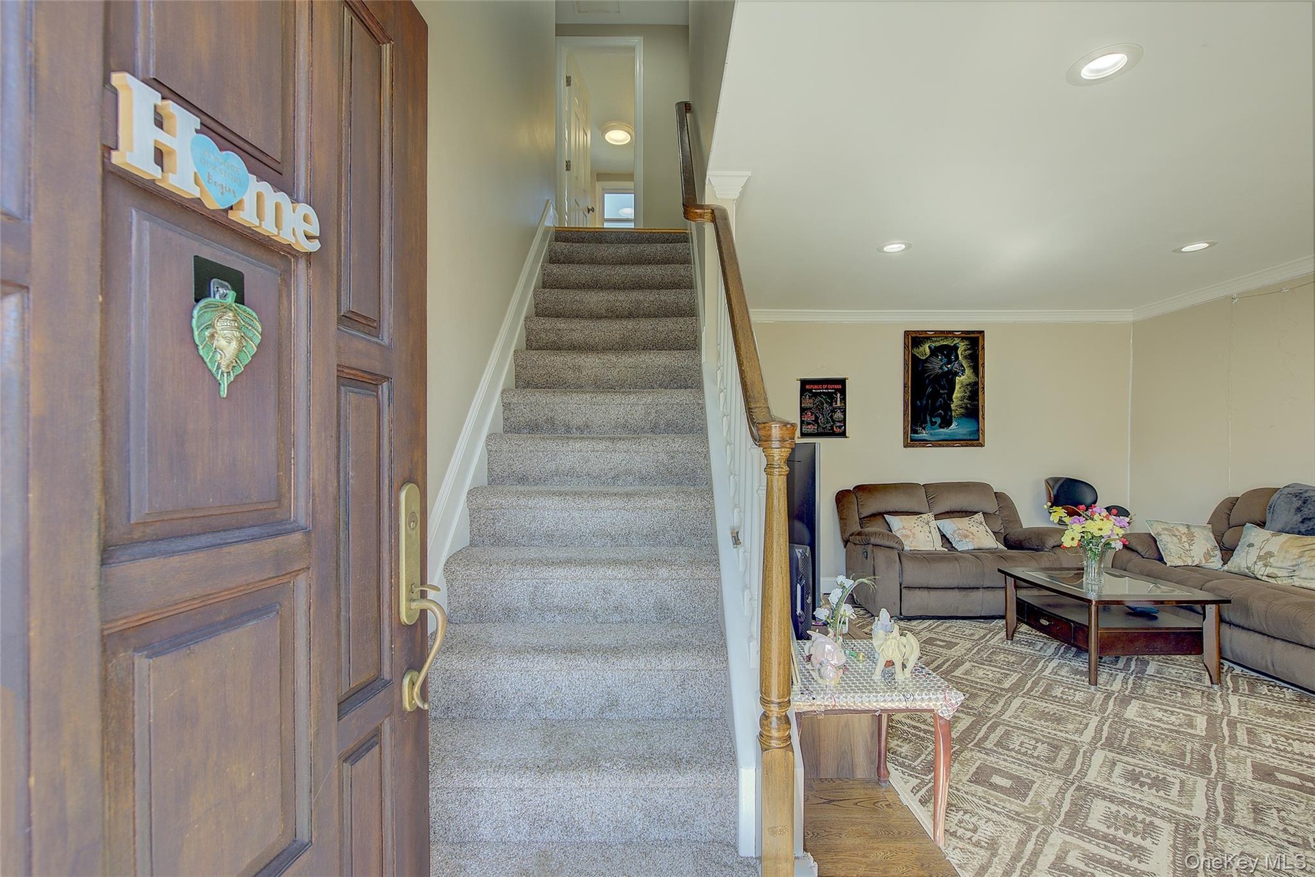 - Living room with crown molding and recessed lighting