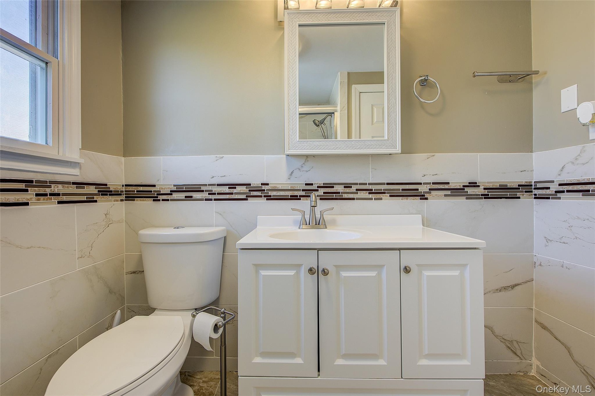 - Bathroom featuring tile walls, vanity, and wainscoting