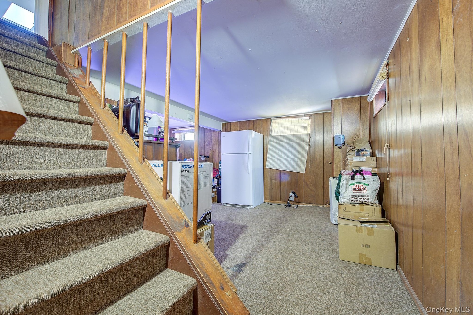 - Stairs featuring wooden walls and carpet flooring
