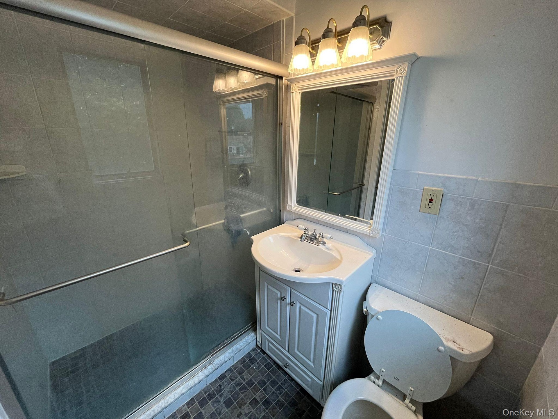 - Full bath with a shower stall, tile walls, vanity, and dark tile patterned floors