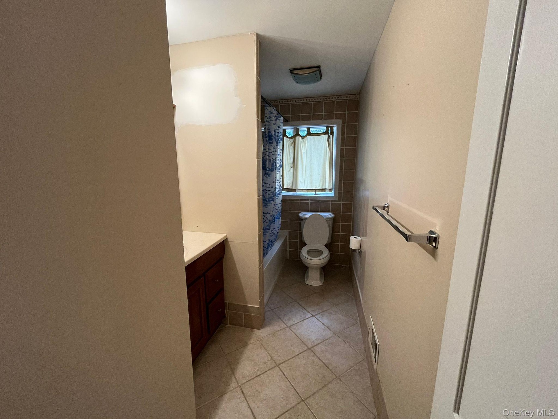 - Bathroom with light tile patterned floors, shower / tub combo with curtain, and vanity