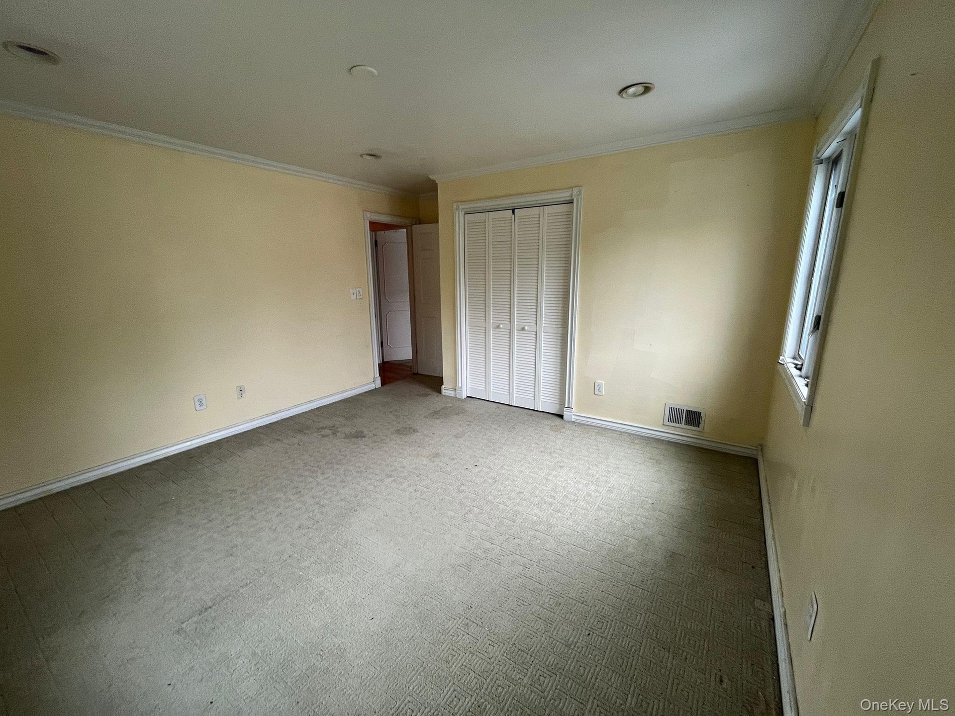 - Unfurnished bedroom featuring ornamental molding, carpet floors, and a closet