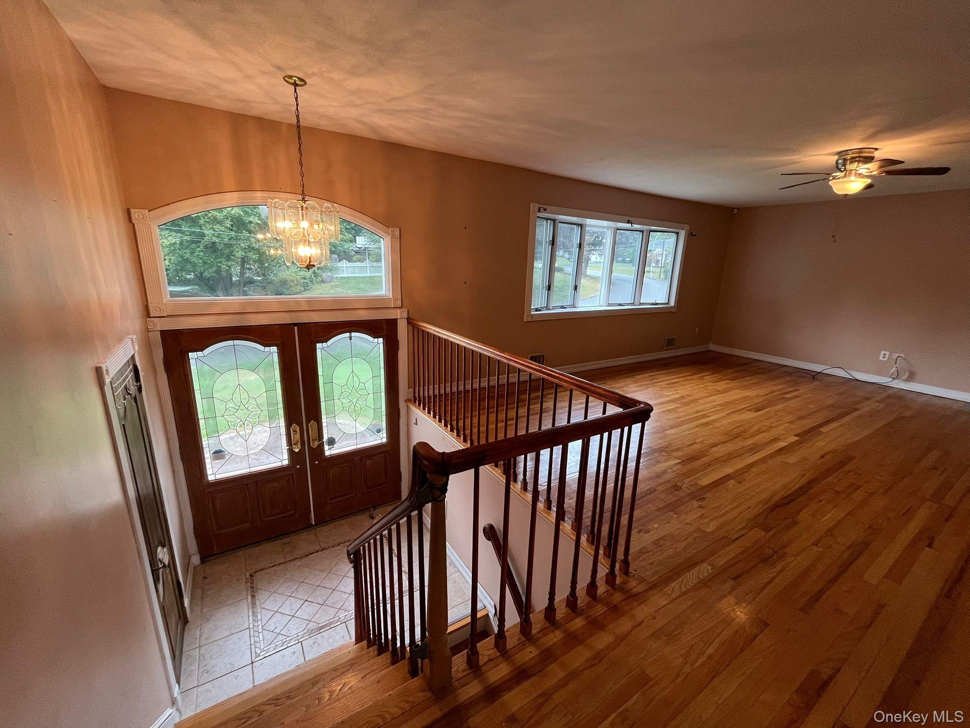 - Foyer entrance featuring a chandelier, french doors, light wood-style floors, stairs, and ceiling fan