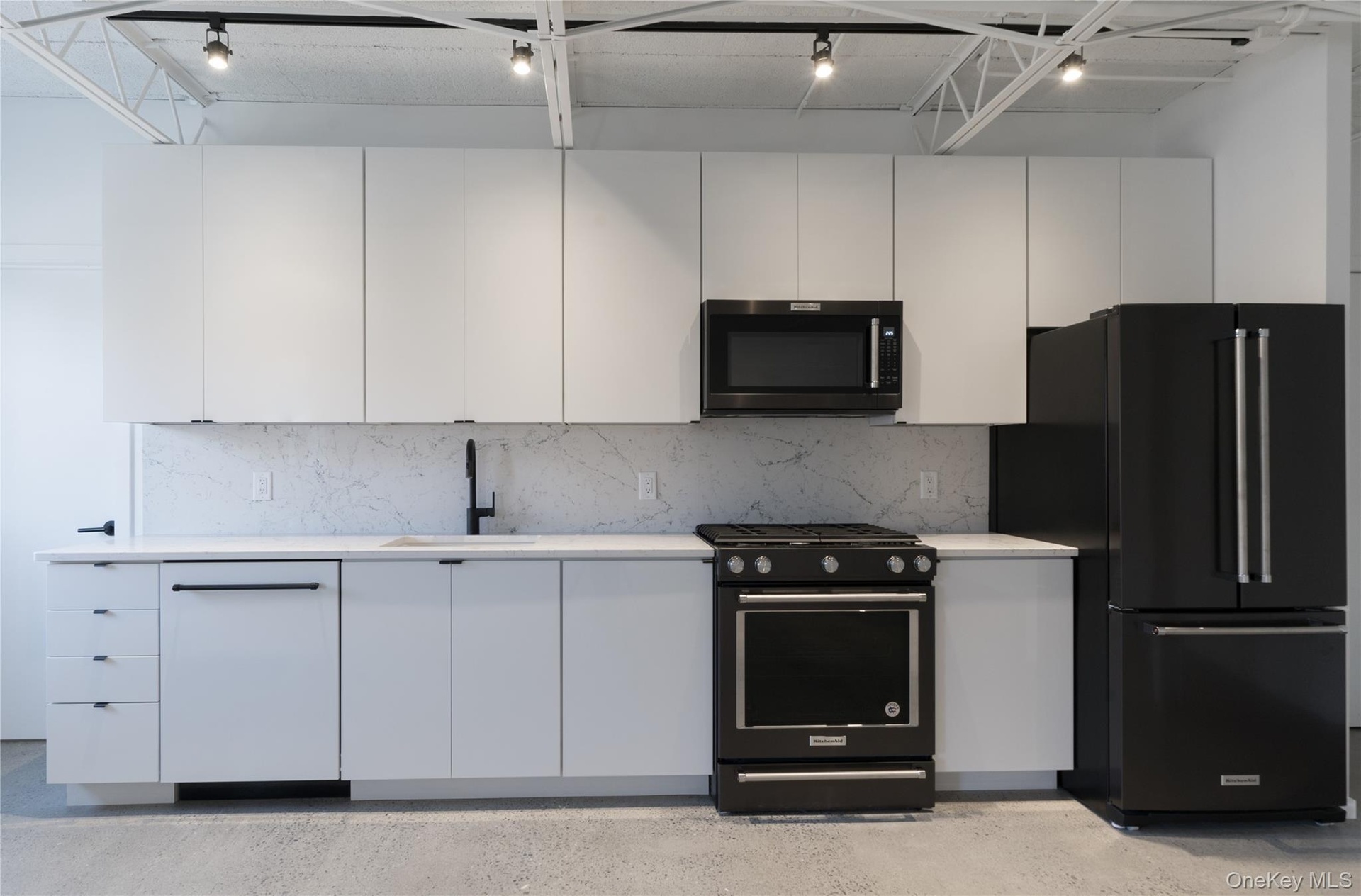 - Kitchen featuring stainless steel appliances, finished concrete flooring, white cabinetry, and backsplash