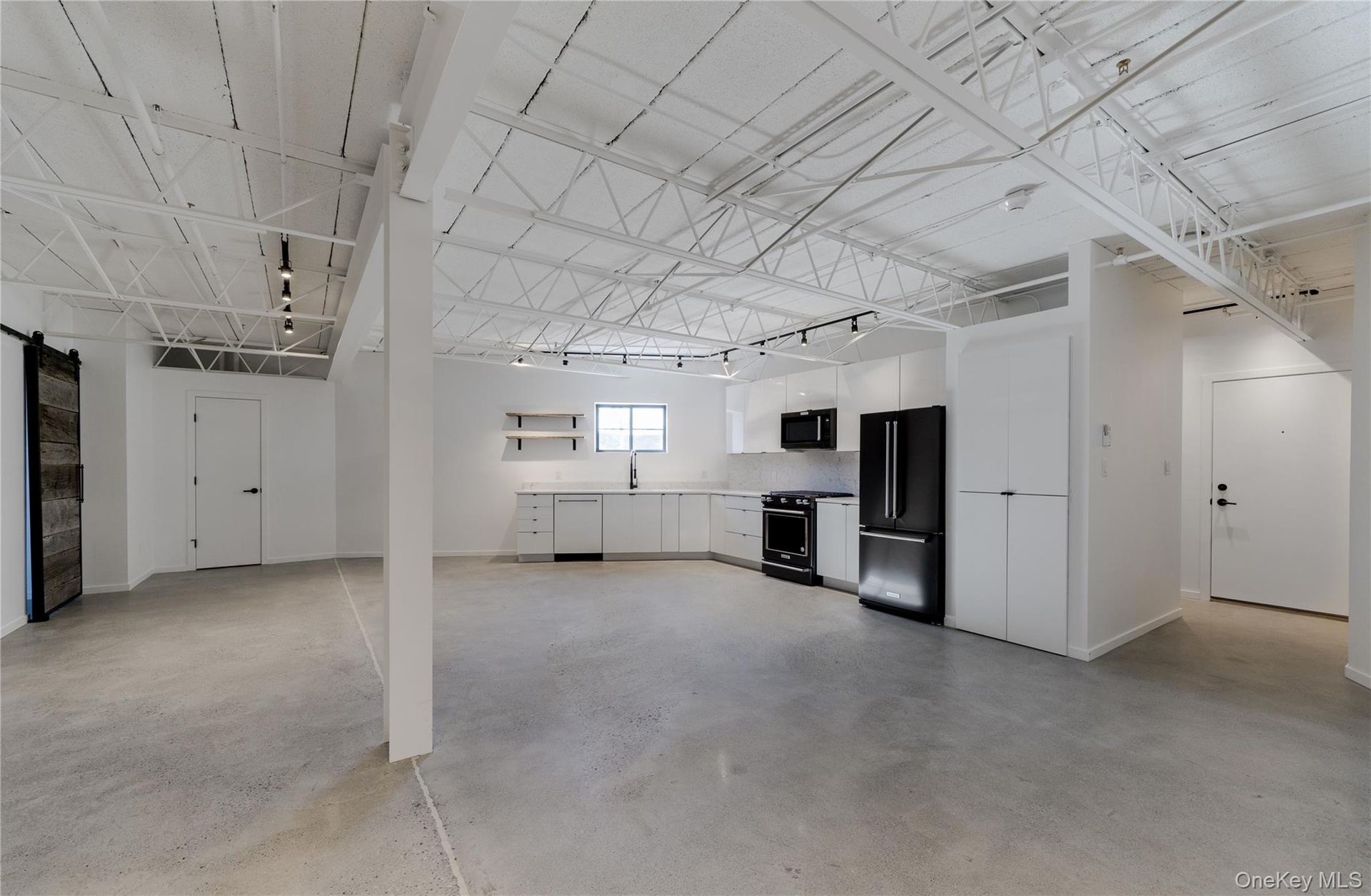 - Kitchen with black appliances, concrete floors, open shelves, and white cabinets