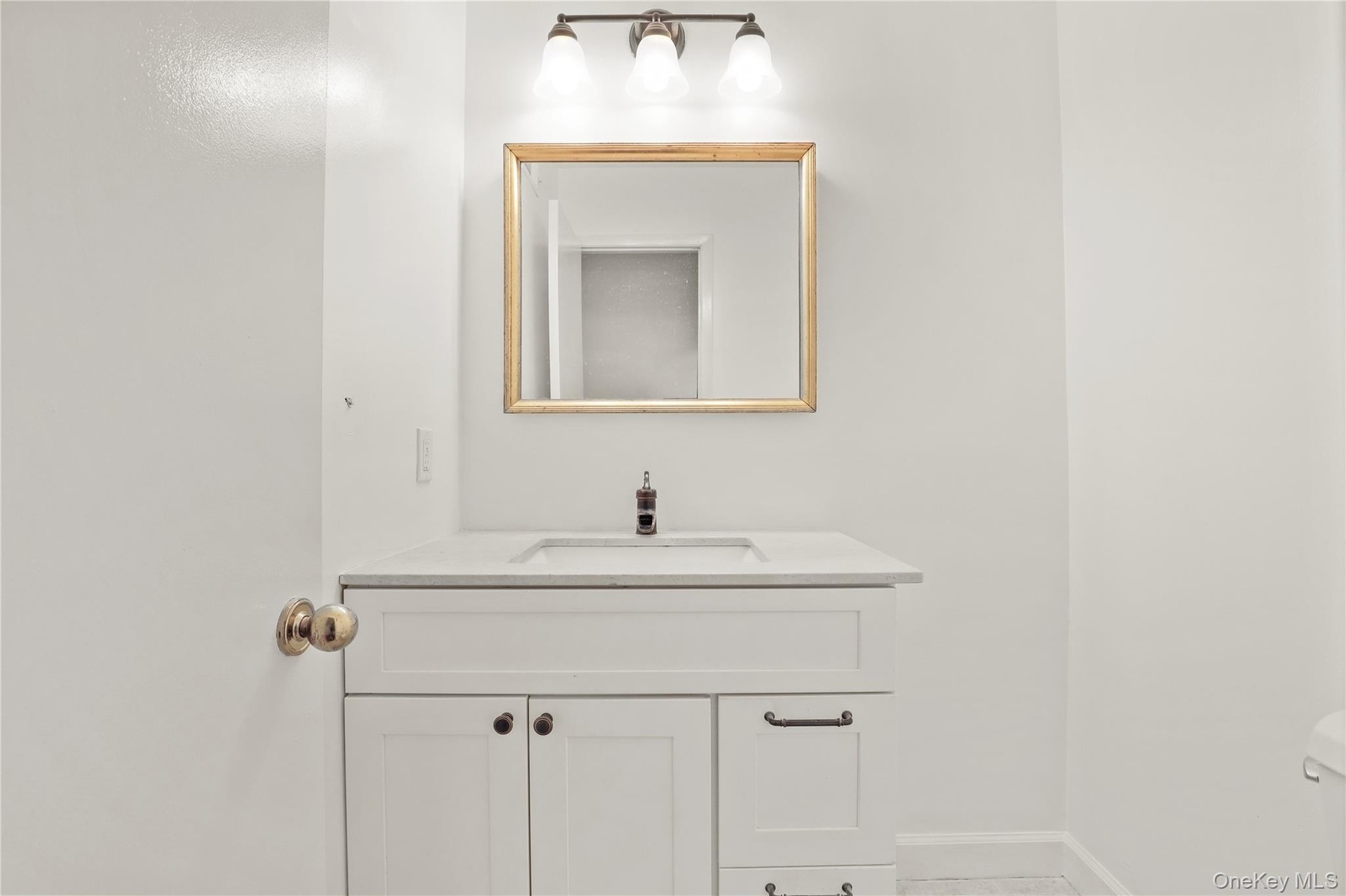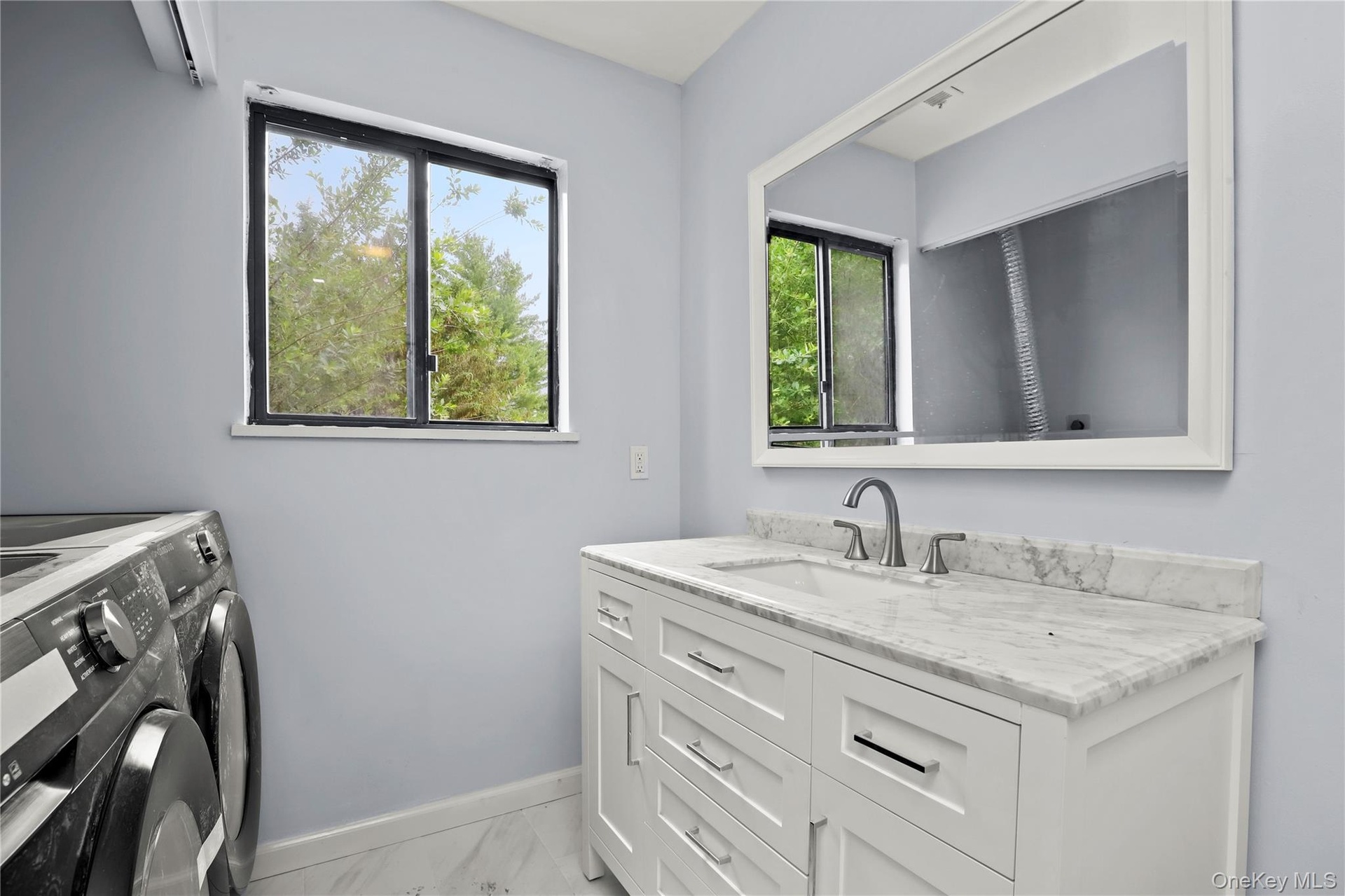 - Bathroom with washing machine and clothes dryer, vanity, and light marble finish flooring