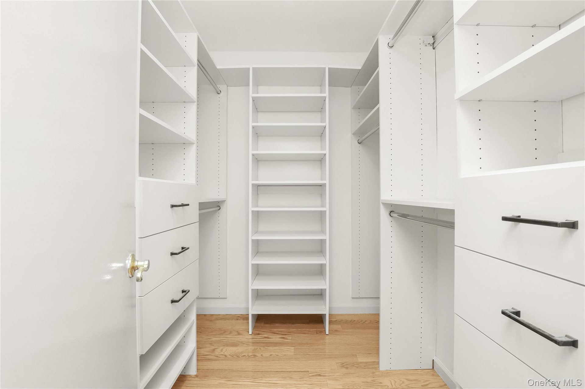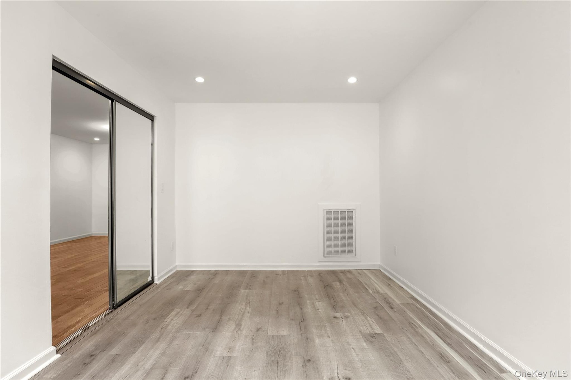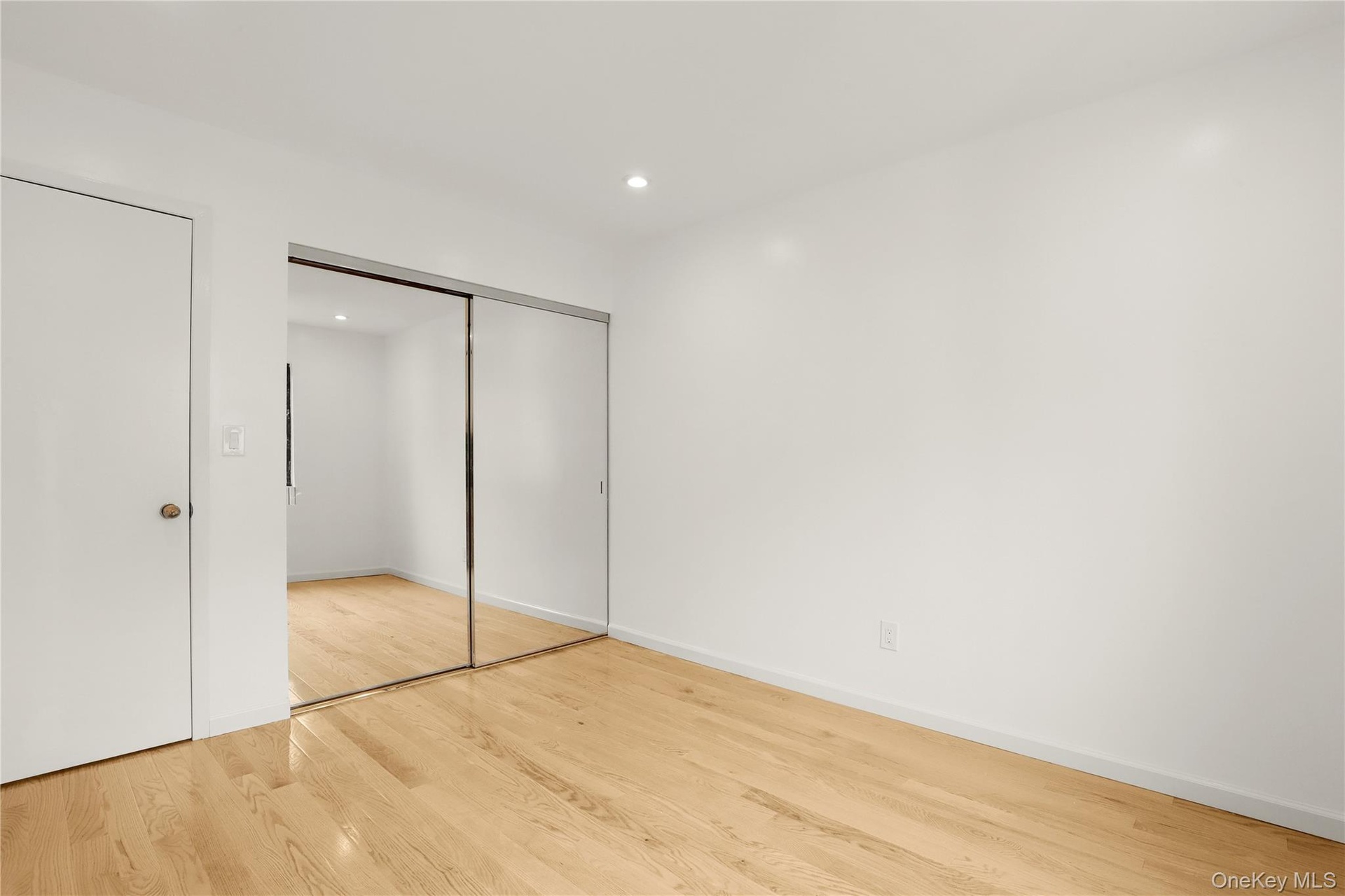 - Unfurnished bedroom featuring light wood-type flooring, recessed lighting, and a closet