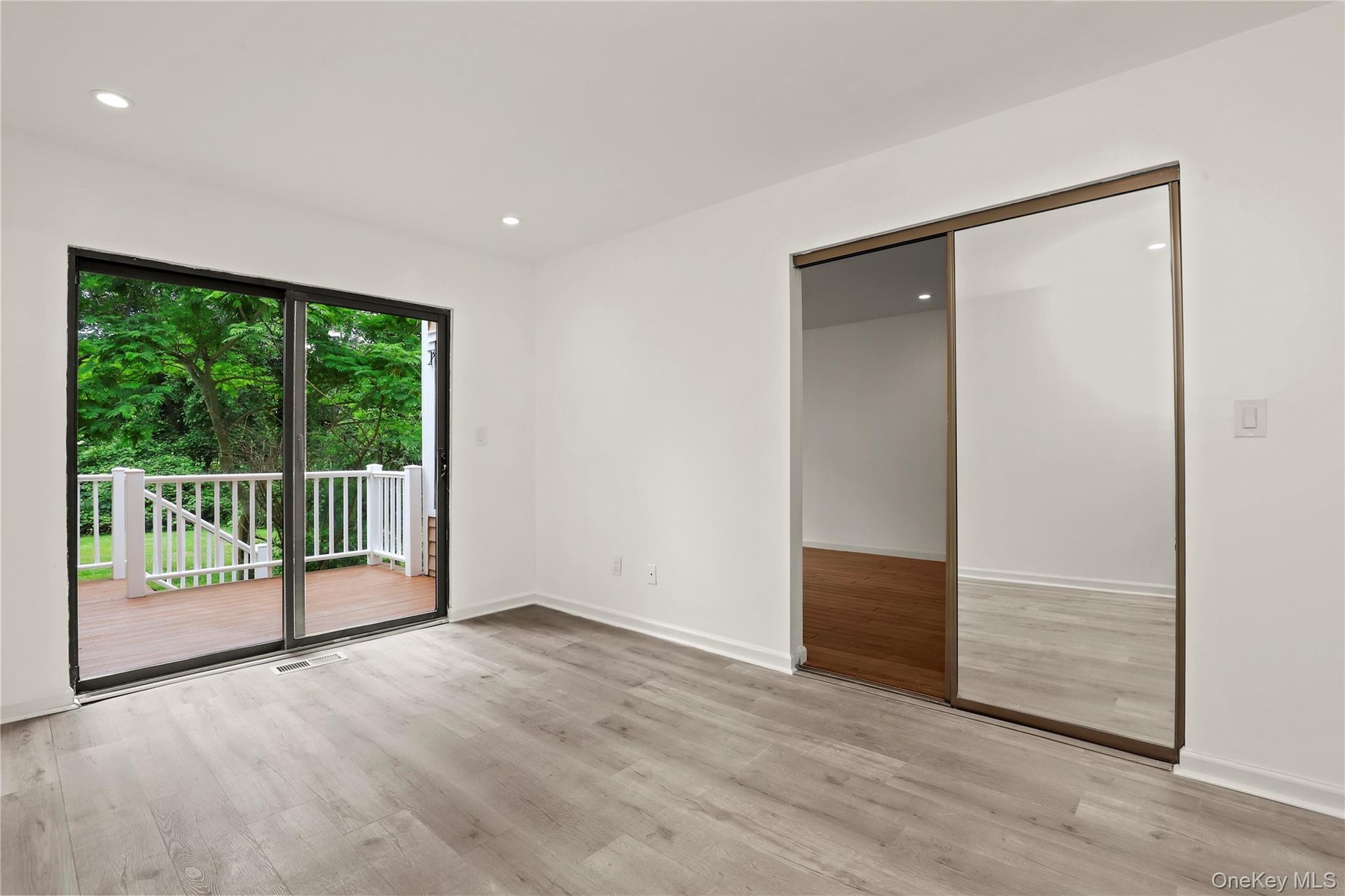 - Unfurnished bedroom with recessed lighting, light wood-style floors, access to exterior, and a closet