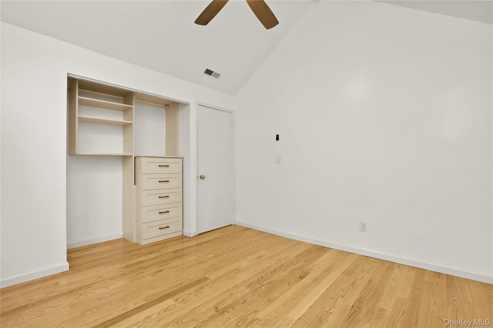 - Unfurnished bedroom featuring a closet, light wood-type flooring, ceiling fan, and high vaulted ceiling