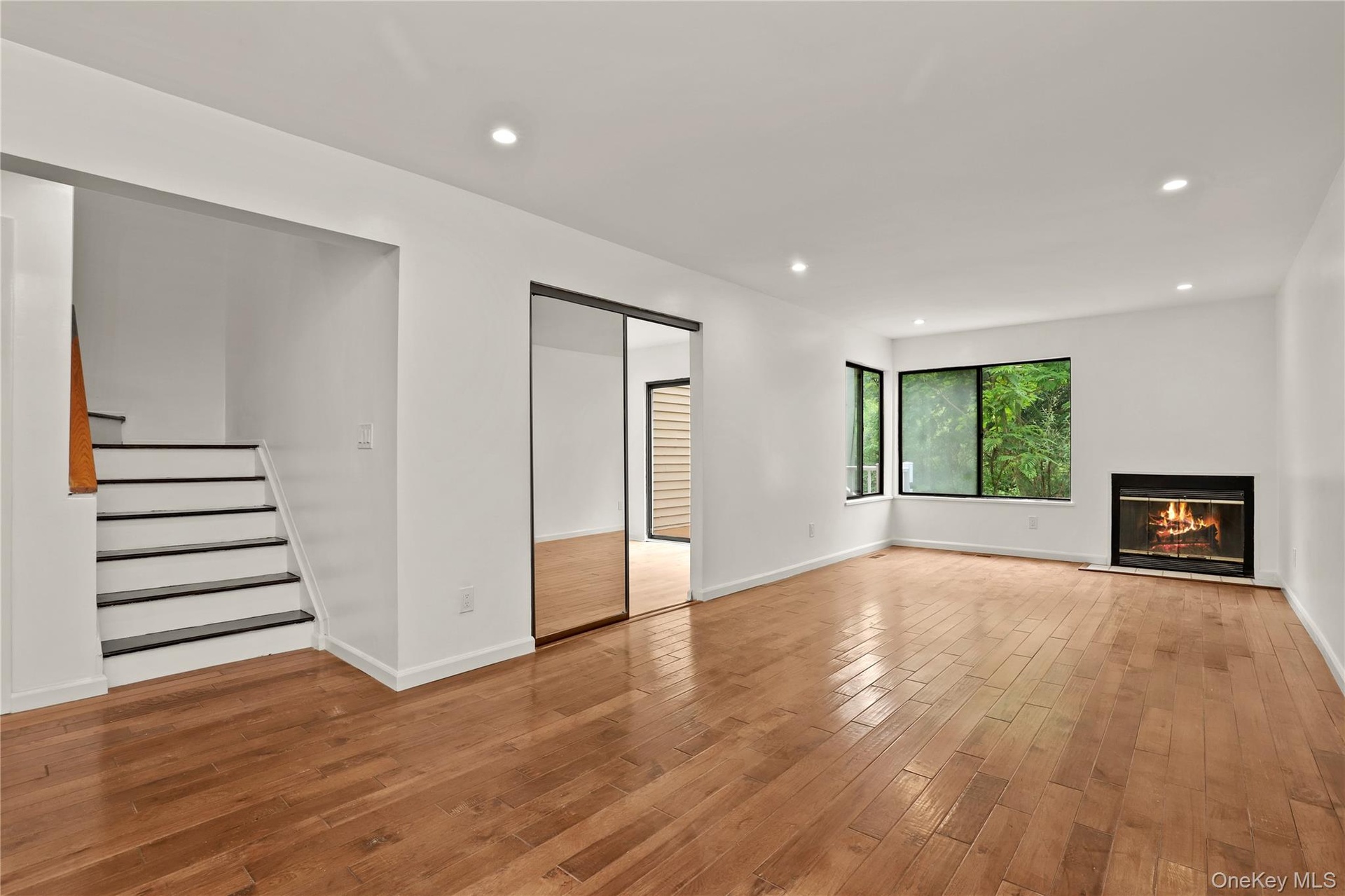 - Unfurnished living room featuring recessed lighting, light wood-style floors, a glass covered fireplace, and stairway