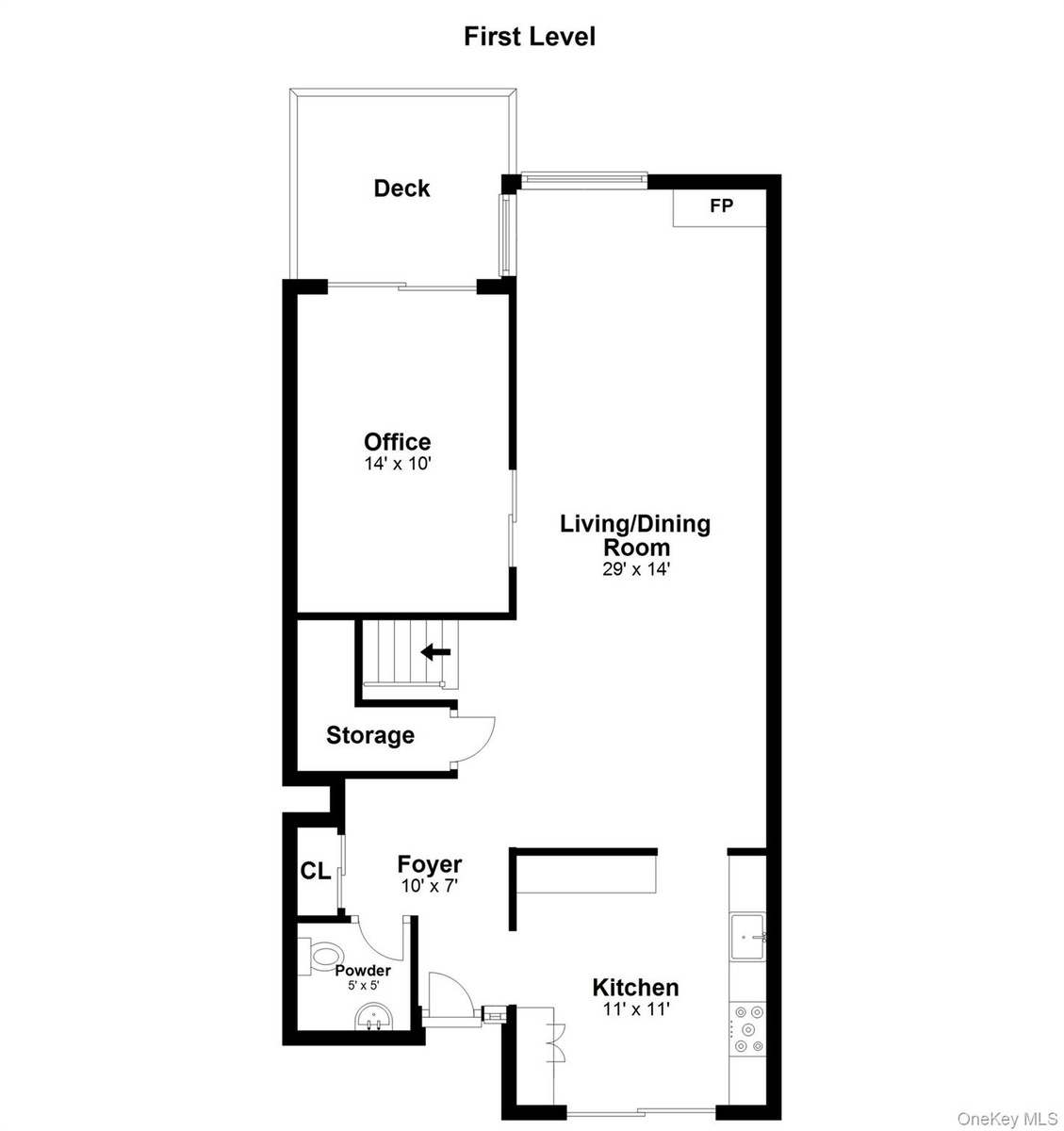 foyer, powder room, updated kitchen with stainless steel appliances, and patio. Large dining/living room with a wood-burning fireplace.